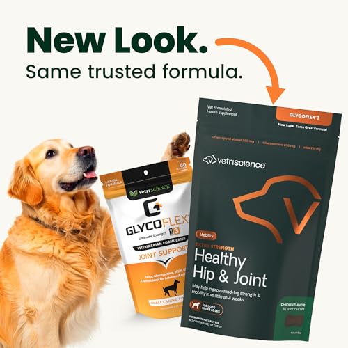 VetriScience Extra Strength Healthy Hip & Joint Chews, GlycoFlex Glucosamine and Green-Lipped Mussel Joint Support Supplement for Small Breed Dogs, Soothe Joint Discomfort, Chicken, 60 Count