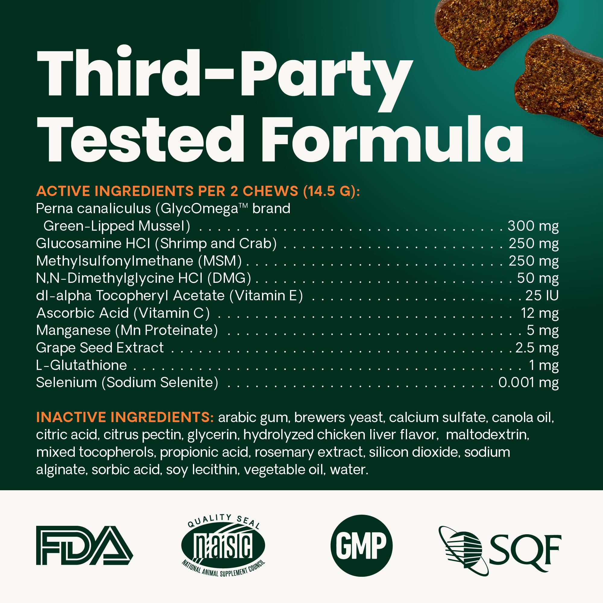 • High-Quality Ingredients: Our vet-formulated dog joint supplements are certified by the National Animal Supplement Council (NASC), routinely undergo third-party testing, and contain no hidden ingredients, artificial flavors, or synthetic colors