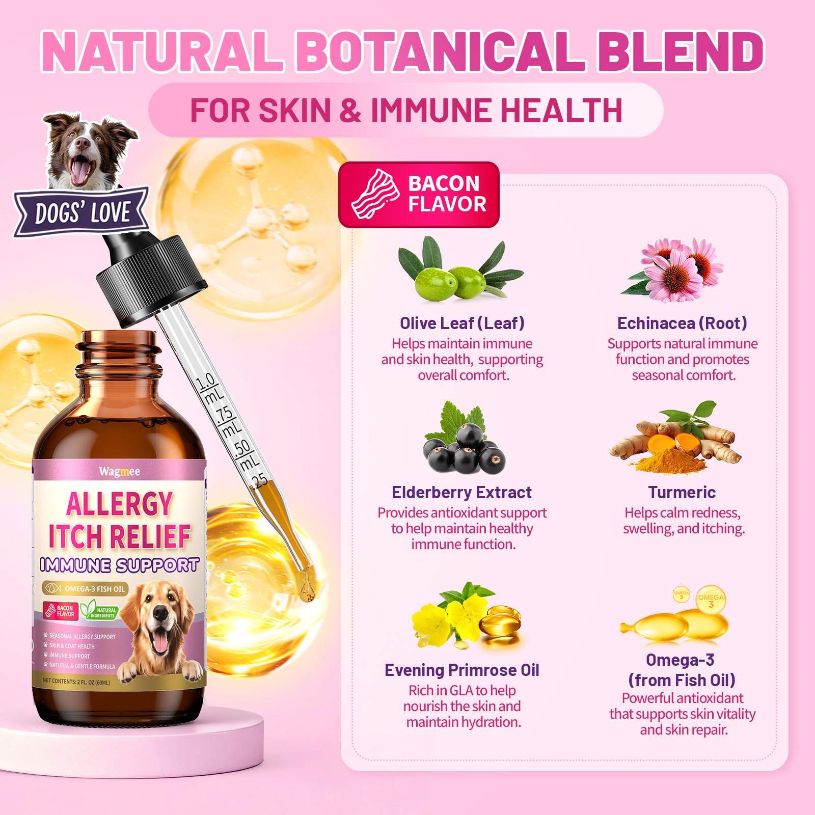 • For Pets of All Ages, Breeds, and Sizes – These delicious bacon-flavored allergy drops are carefully formulated to be safe, gentle for all breeds and life stages. Each 60ml bottle provides consistent support for allergies and itching, helping relieve dry skin, licking, and help overall skin and coat health. For best results, simply follow the recommended daily amount based on your dog’s weight to ensure lasting comfort, strong immunity, and daily wellness.