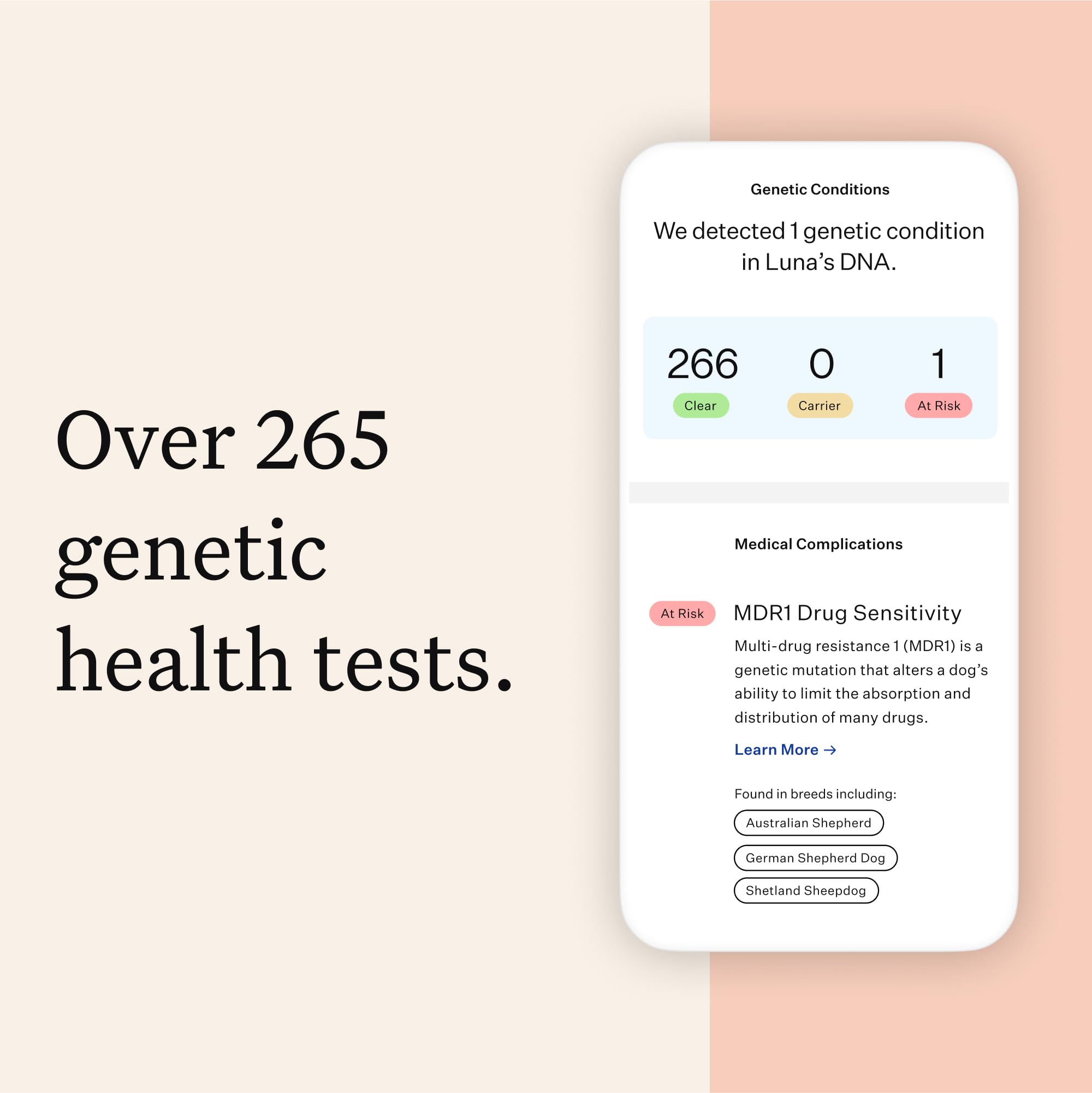 - Screen For More Health Conditions Than Any Other DNA Test. We test for 265+ genetic health conditions (including MDR1, IVDD, POMC, and urinary stone risk) so you can get ahead of health risks and create a personalized care plan with your vet.