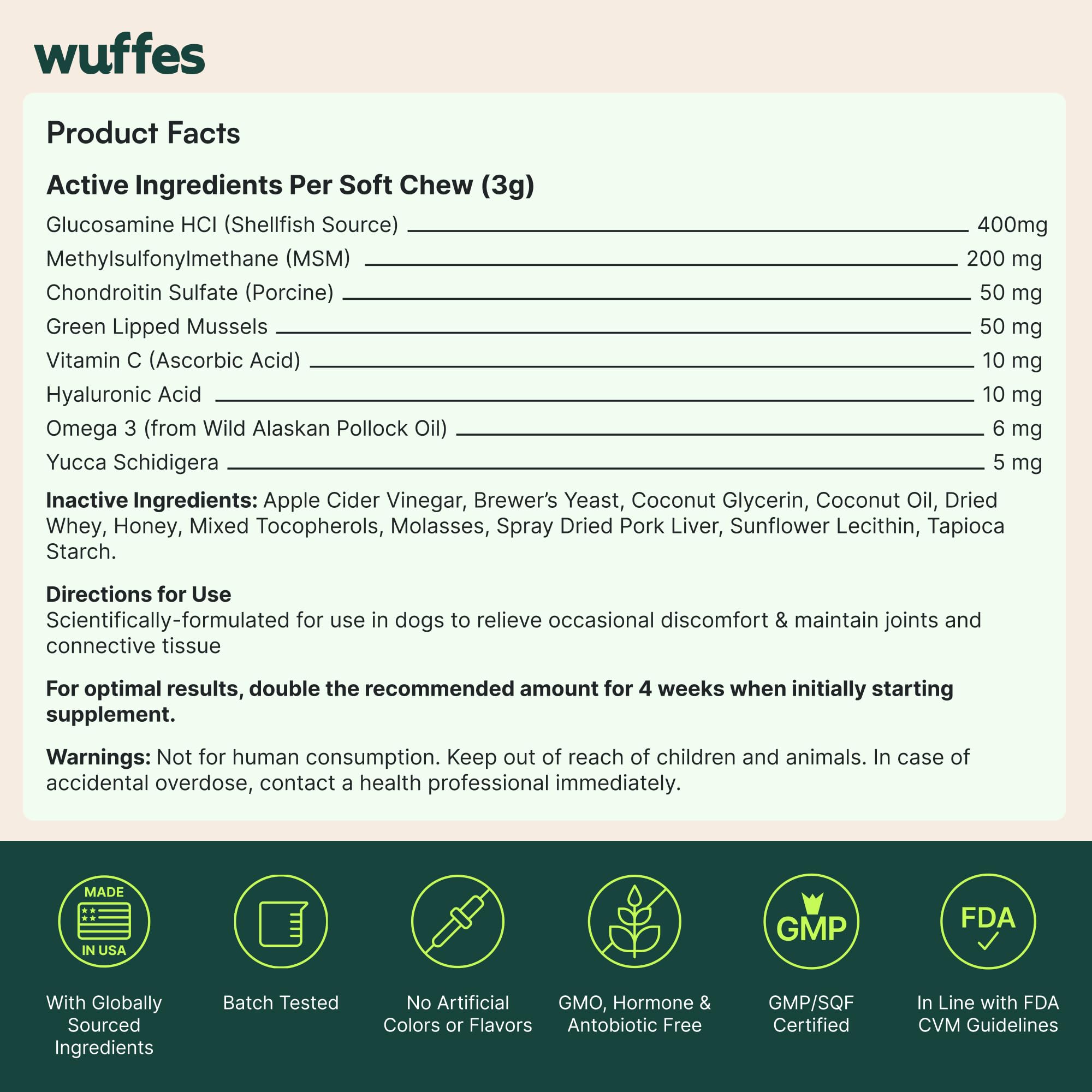 - Scientifically-Backed Ingredients: Expertly formulated by our in-house pet scientists, Wuffes Hip & Joint Support is made with ingredients known to help maintain healthy cartilage, promote joint integrity, and support long-term joint health.