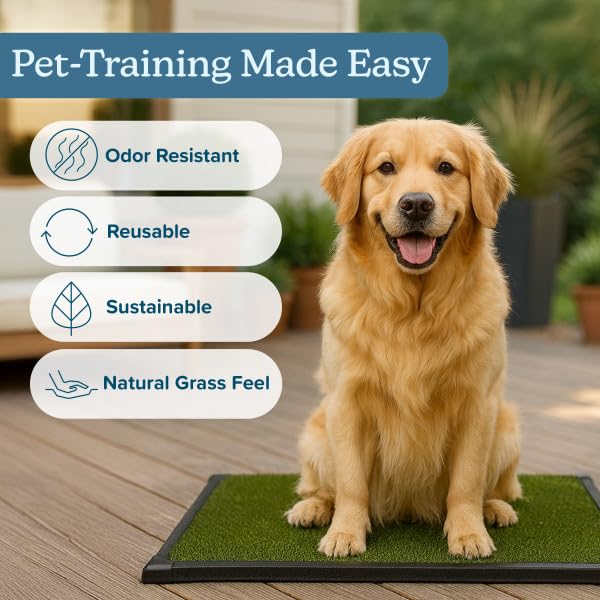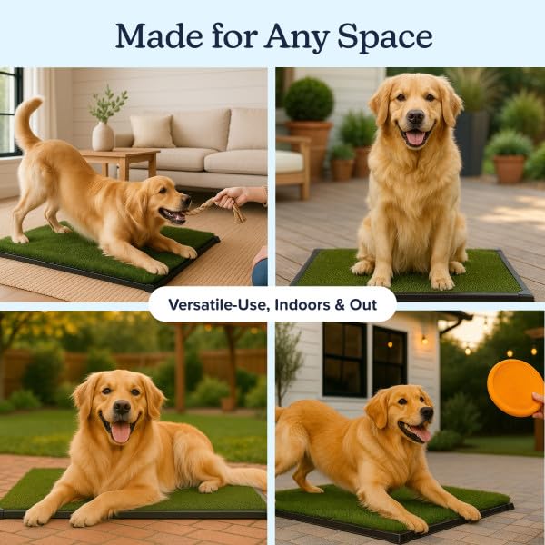 - DOG PEE GRASS WITH TRAY - The washable artificial turf dog pee pad provides a sanitary place for your pet to relieve themselves inside or on your balcony or patio. It’s a reusable alternative to disposable dog training pads for small to medium-sized pets.