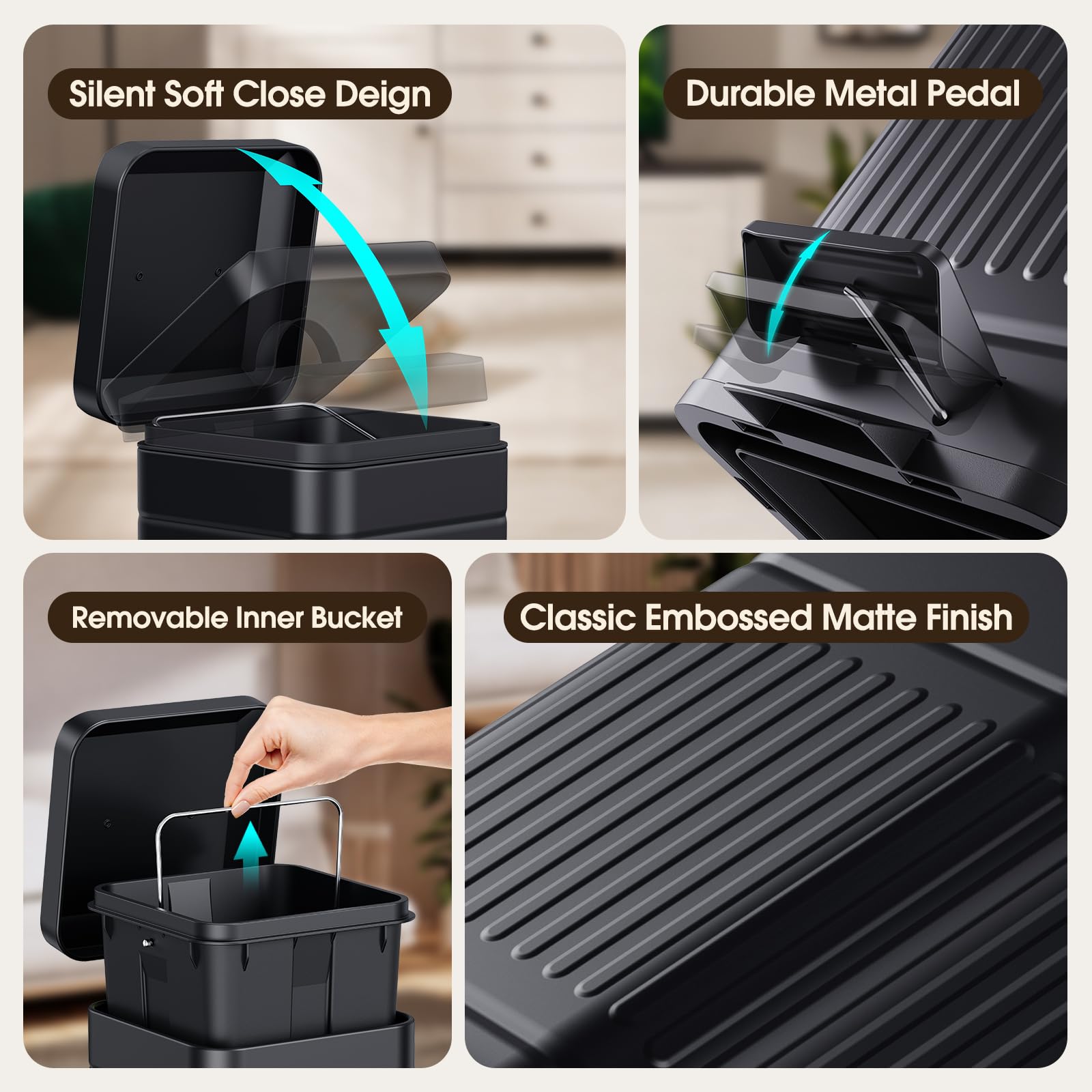 - Silent Soft Close: The step trash can has a damper arrangement that retards the close of allows the lid to close quietly and safely by itself every time, don’t worry about disturbing the rest of your family