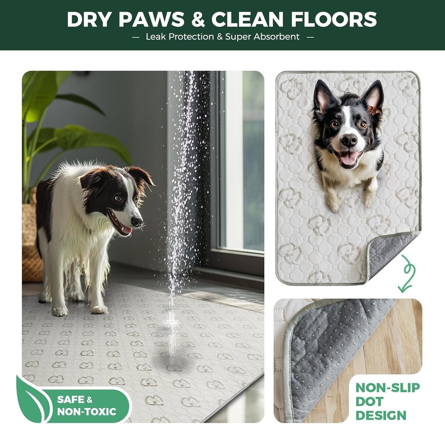 - Super Absorbent: Each dog pad absorbs up to 2.0L of liquid with a thick, heavyweight cotton layer — perfect as a dog playpen mat to keep your pup’s space clean and dry all day.