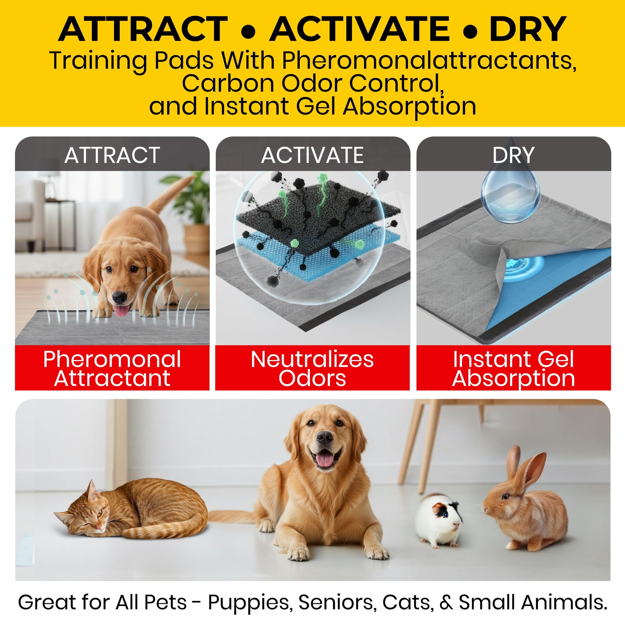 - ADVANCED ABSORPTION TECHNOLOGY - Featuring Activated Carbon, These Super Absorbent Pads Trap Moisture & Lock In Liquids Instantly. Ideal As Housebreaking Supplies To Ensure A Dry Space While Protecting Floors From Spills With Leak-Resistant Edges