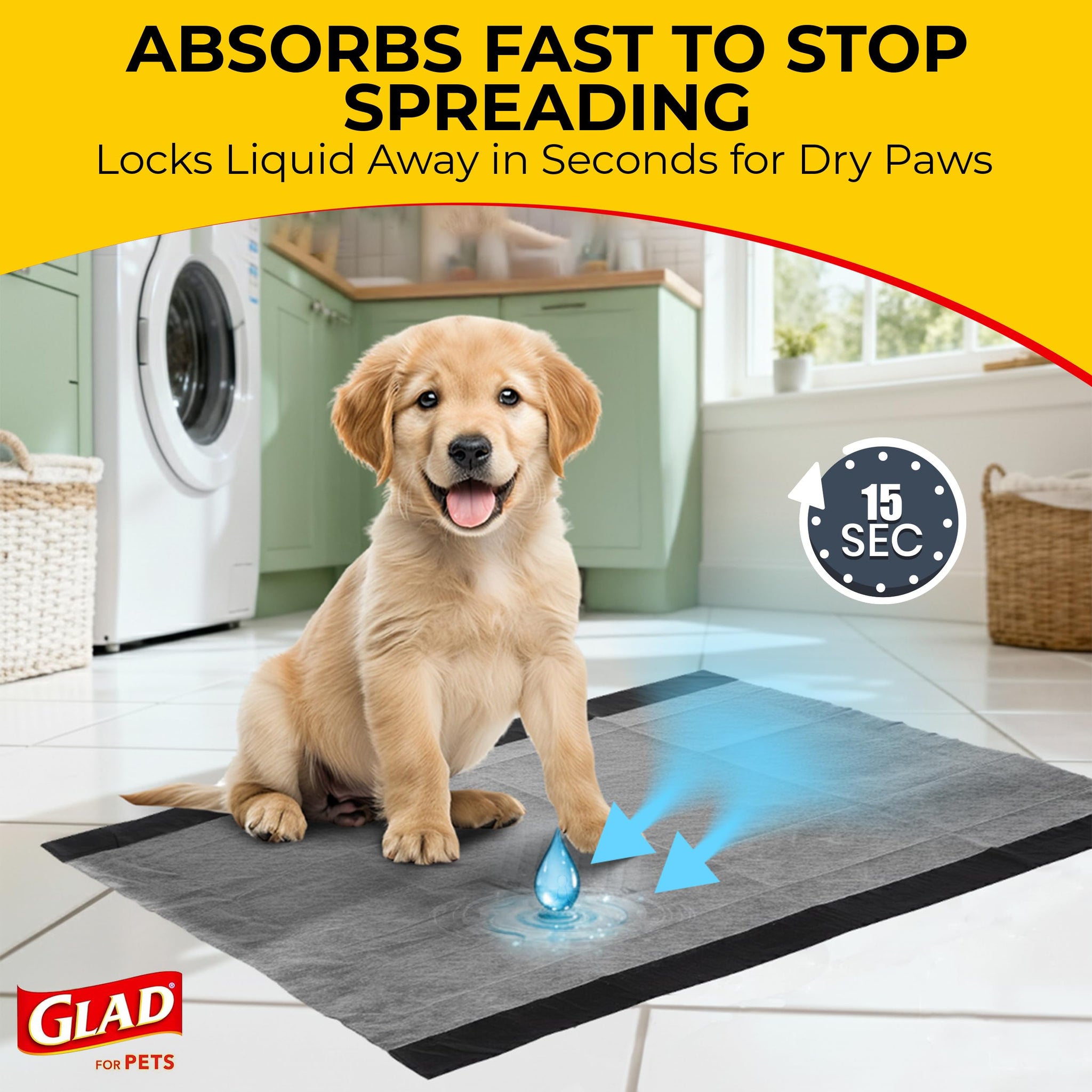Details: Glad for Pets waste bags, dispensers, and pet training pads are dependable and specially designed for easy cleanup! Built with Glad-level strength, everyday training and cleanup accessories bring innovation to each stage of your dog's life, from potty training pads using activated charcoal technology to daily waste bags with dispensers. Why choose between leak protection and odor control when you can have it all with Glad All-in-One dog training pads! Glad Jumbo/XL activated carbon disposable pee pads for dogs are made with five layers of strength for leak-proof protection. The activated carbon layer absorbs odor and yellow spots while the polymer layer absorbs and locks in liquid, all while turning it into a gel. The quilted cushion technology prevents your pet's urine from spreading. These puppy potty pads use a pheromonal attractant, which helps make dog training a breeze. This dog attractant shows your dog or puppy exactly where he or she should go. These dog pee pads can hold up to six cups of liquid and absorb in under 30 seconds. These super absorbent pee pads for dogs are perfect for potty training puppies and dogs, and for senior dogs that need extra assistance while inside. Puppy pads are also effective as a dog crate pad or dog bed liner and are easy to clean up and throw away once they have been soiled. Disposable pet pads measure 28 by 30 inches and are ideal for homes where multiple dogs are using wee wee pads, and where pet pad disposable changes happen less frequently. Be sure to check out Glad Ultra-Absorbent Training Pads as well as Activated Carbon Pads for more options. Introduce your pet to the pad by gently placing them on it several times to sniff and become familiar. Reward your pet when they relieve themselves on the pad. Gradually move the pad closer to the door to teach them to go outside. If your pet has an accident elsewhere, bring them to the pad to reinforce correct use.