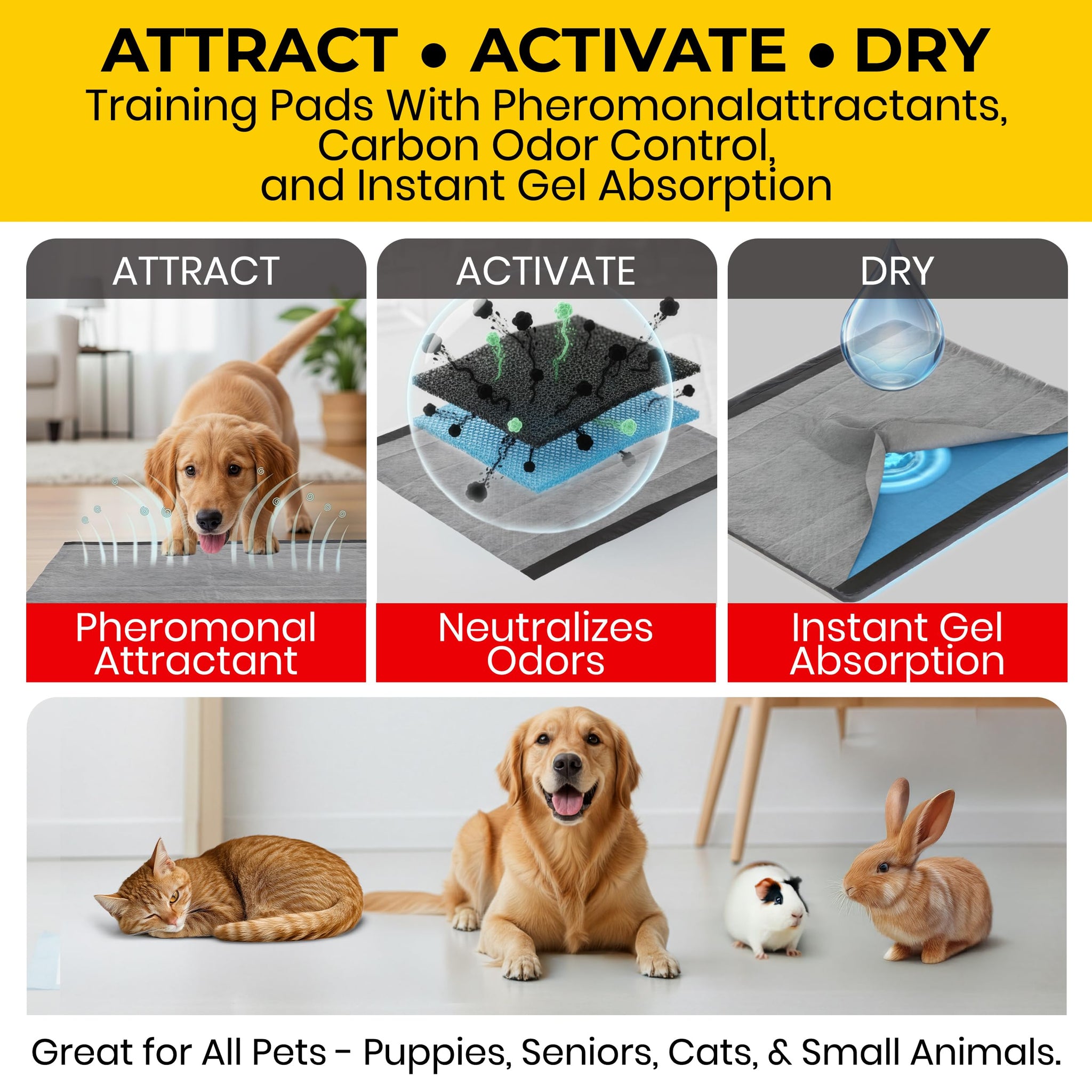 - CARBON TECHNOLOGY - Activated charcoal layer neutralizes odors and absorbs yellow spots while quilted cushion technology prevents liquid from spreading and a polymer layer turns urine into a gel, ideal for pet pads disposable.