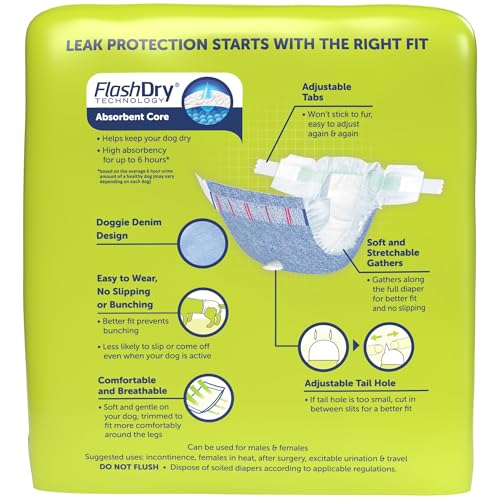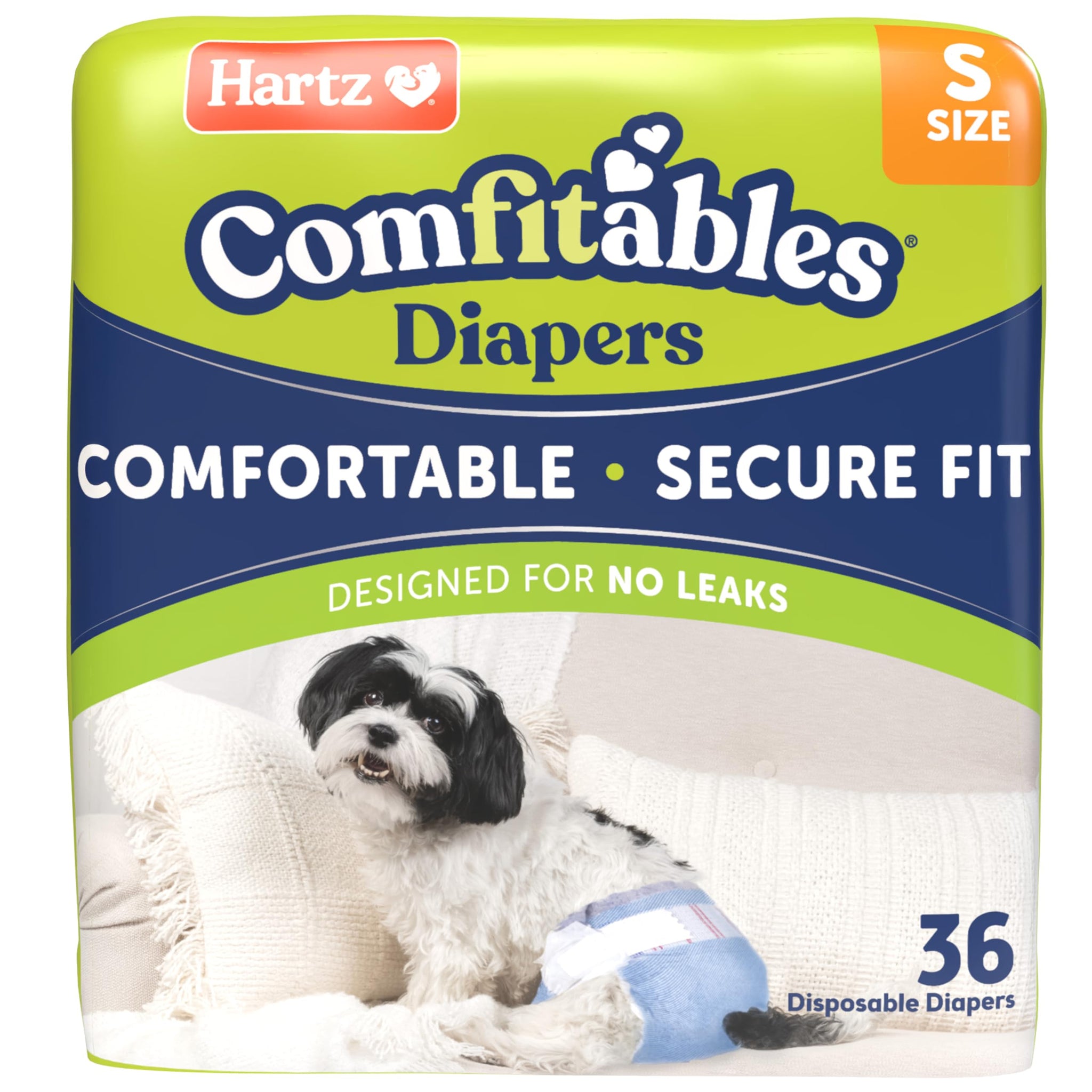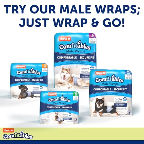 Details: Hartz® Comfitables® super absorbent disposable dog diapers can be used by both male and female dogs. Comfitables® are designed with comfort and secure fit in mind, made with soft lightweight breathable material in a new fashionable doggie denim design.