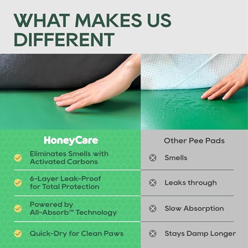 Details: HONEY CARE All-Absorb Super Absorbent Training Pads are leakproof, quick-drying potty pads with enhanced odor control. A special attractant is used to signal the proper potty spot when you’re housebreaking a new puppy. Each pad has five layers of protection. This 5-layer system helps contain messes, making them less smelly and easier to clean up.