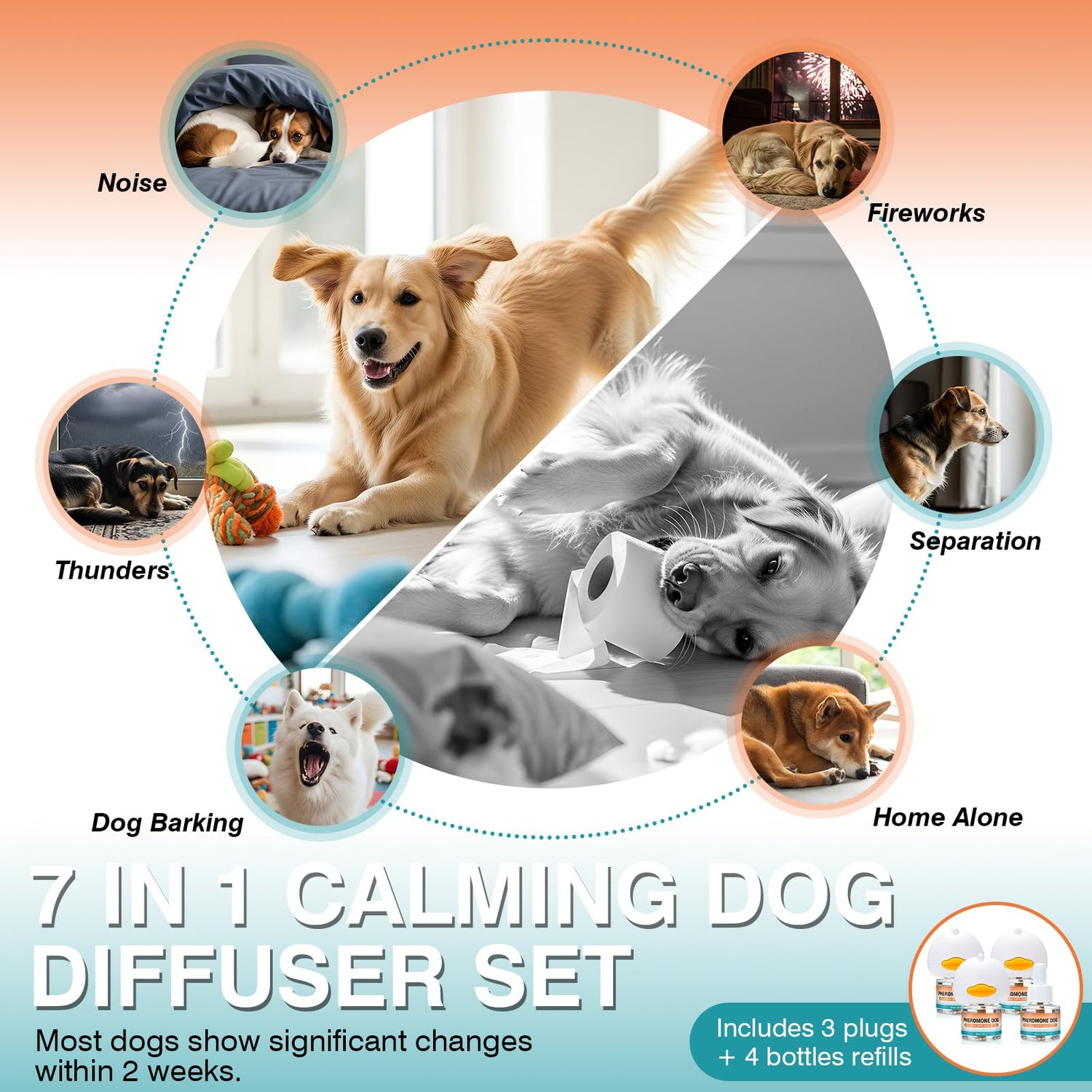 - Note: The effect of dog diffuser may vary depending on the dog's temperament and living environment Dog pheromones calming diffuser provides a effective solution to your dog's anxiety problems. Most pet owners reported that after using calming plug in for dogs for 2 weeks, the dog's barking was reduced, and even the destructive behavior caused by separation anxiety was significantly alleviated.