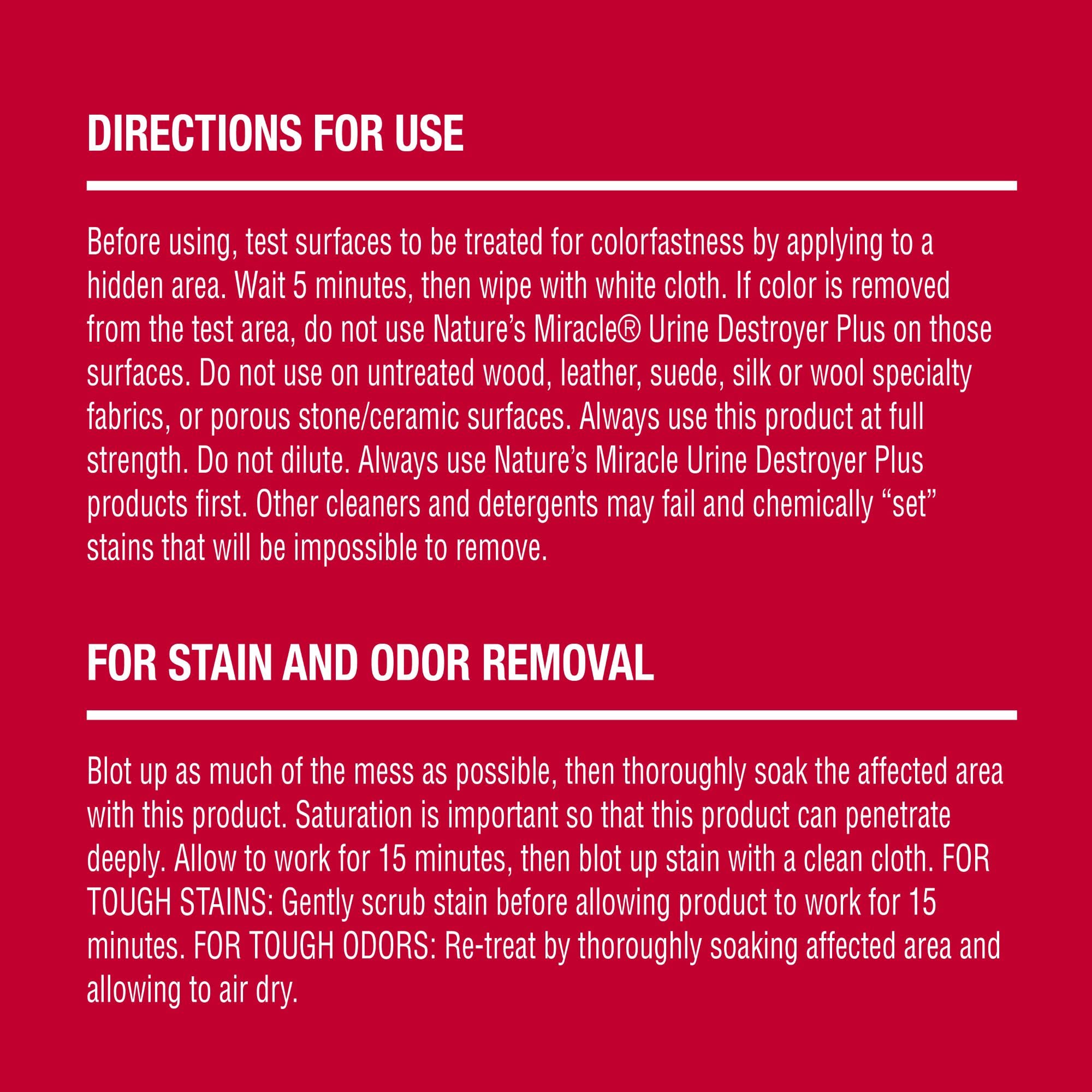Details: Nature’s Miracle® pet stain and odor removers have been a trusted brand for pet mess cleanup for 40 years. Nature’s Miracle stain and odor removers, virus disinfectants, training aids, litter and waste management and grooming products offer solutions for life with pets, from everyday messes to the toughest cleanup jobs. Whatever pets do, you can trust Nature’s Miracle products to undo. Accidents happen, as every dog owner knows. Nature’s Miracle® Dog Urine Remover is an enzymatic formula that removes dog urine and the yellow, sticky residue it leaves behind. The bio-enzymatic formula targets urine messes to remove strong dog urine stains and odors. Use it on carpets, hard floors, furniture, fabrics and more. The dog odor control formula penetrates down into carpet to power out urine messes. Plus, it freshens with a light scent. This product is safe for pets and home when used and stored as directed.
