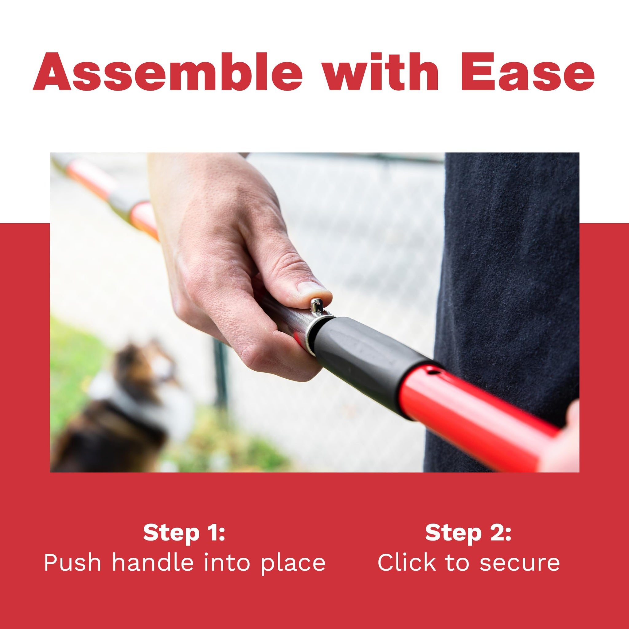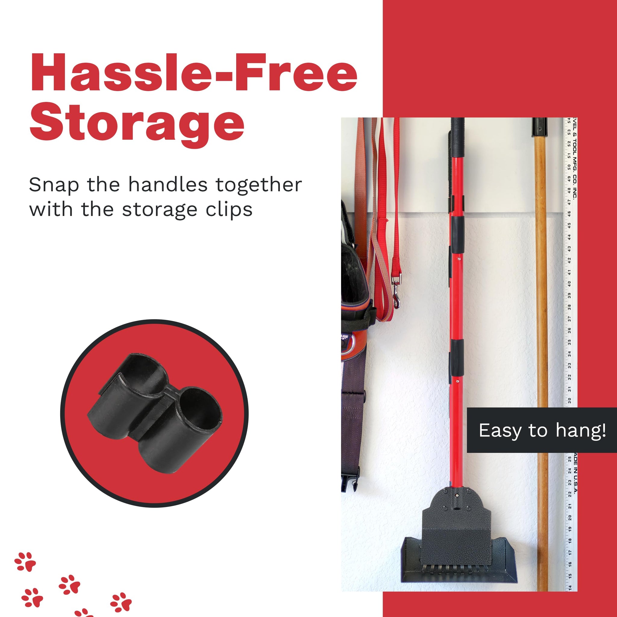 - Easy assembly, simple storage - Assembling the pooper scooper for medium dogs is a breeze out of the box and is as simple as a push and click. No extra tools needed! Push-pin installation adds extra durability compared to twist installation that unravels with use. Use the holes in the handle grip to store on the wall in your garage or tuck it away neatly in a backyard corner for convenient access.