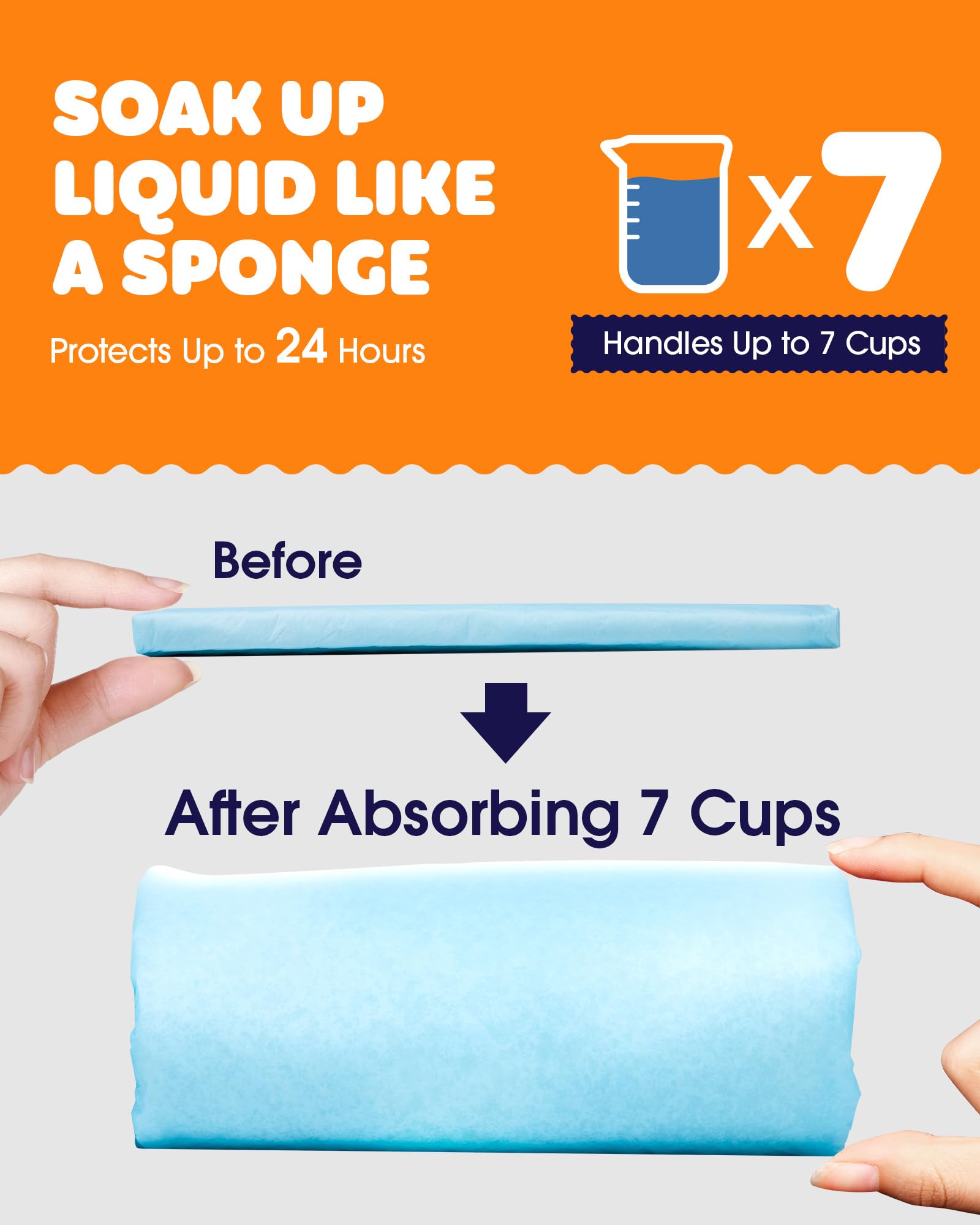 • QUICK-DRY & ABSORBENT: Featuring a 6-layer construction, these puppy pee pads can hold up to 7 cups of liquid for all-day use. The super-absorbent polymer core quickly locks in moisture and turns it into gel, keeping your floors dry and your pup’s paws clean.