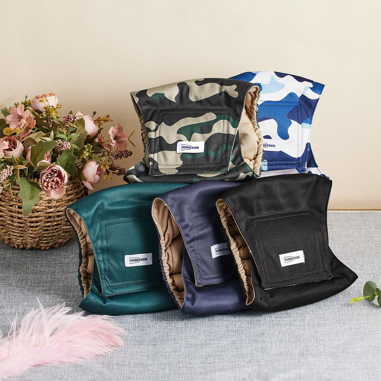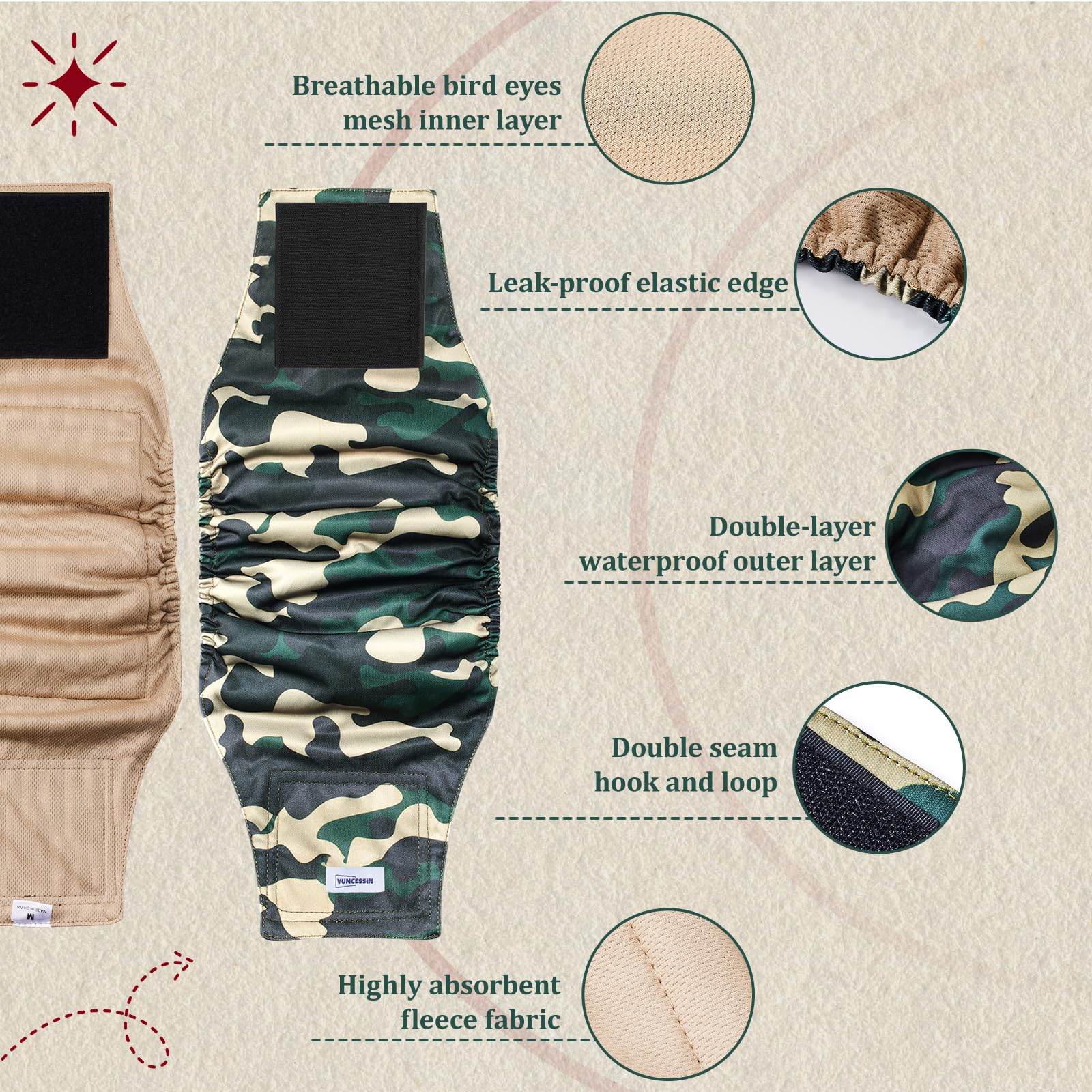 • Breathable and Comfortable: The lining surface of this male dog wrap is made of breathable and soft knitted fabric, which is skin-friendly and comfortable for your pet to wear without burden. The khaki-colored lining allows you to check your dog's urination in time and protects your puppy male dog's nappy from urine stains, which can affect the aesthetics and prolong the service life. The ones with shrink-stretch edges can fit the waistline and increase wearing comfort.
