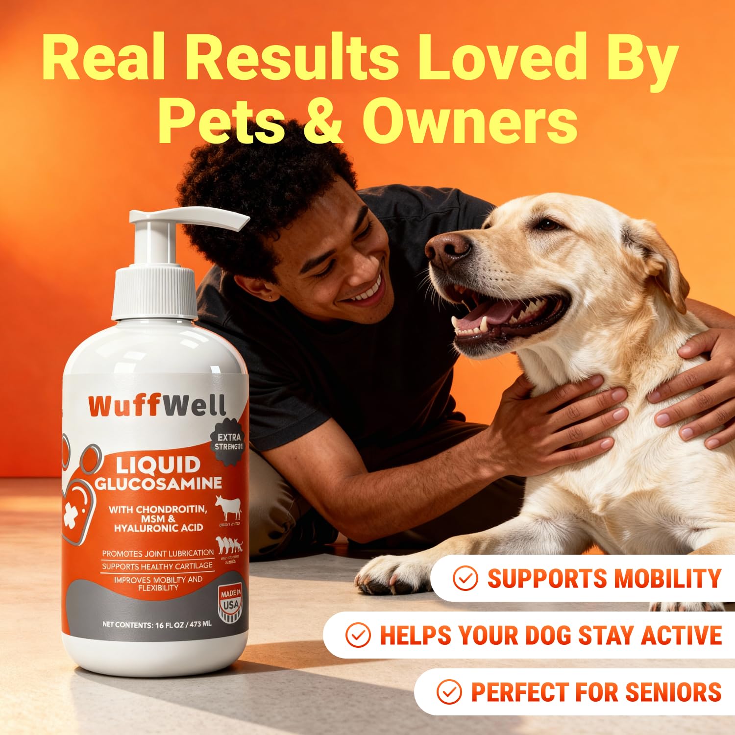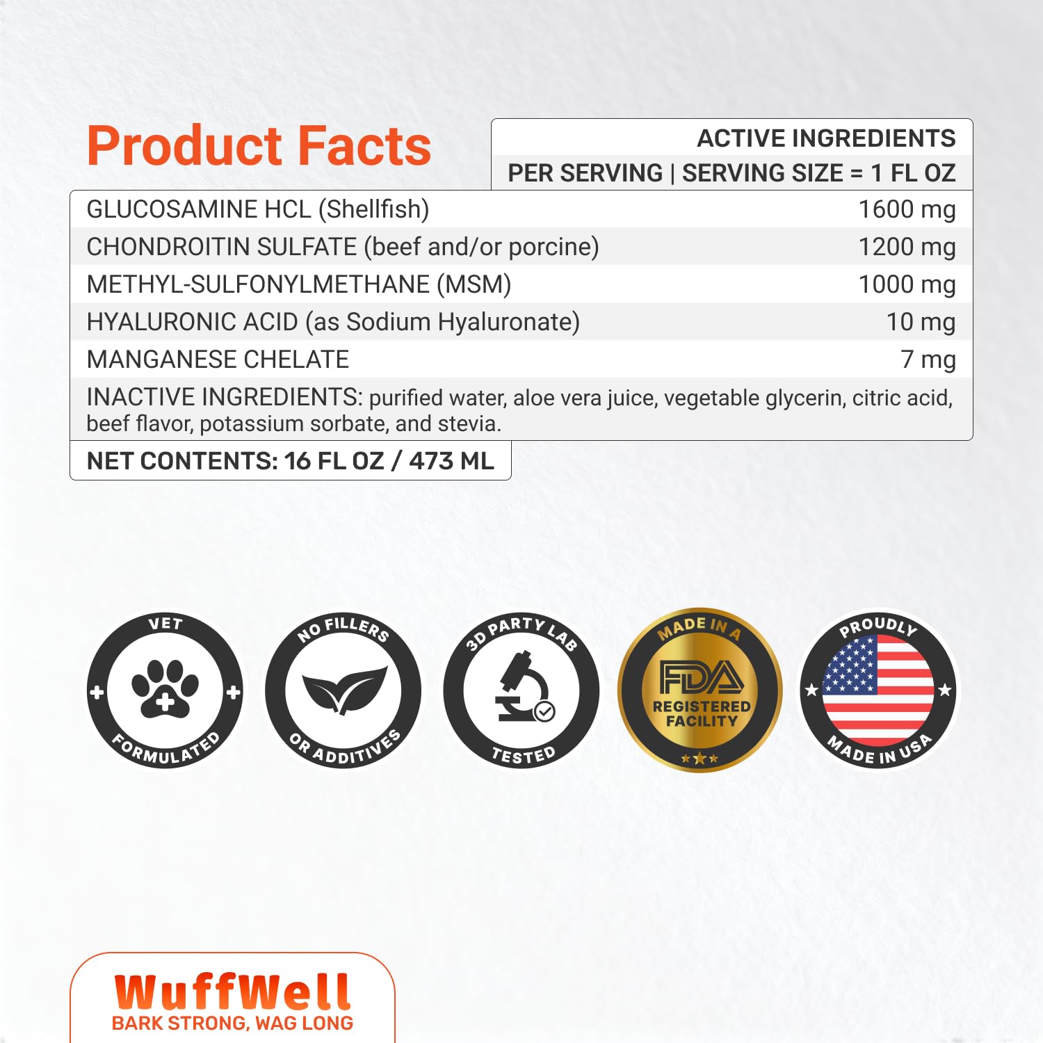 • Proven Quality and Trust: Rely on WuffWell to provide top-tier liquid glucosamine for dogs, formulated with carefully selected ingredients to meet the highest standards. Backed by happy pet owners who have witnessed the transformation in their companions, it's a trusted choice for safeguarding your pet from joint discomfort and embracing years of tail-wagging joy.