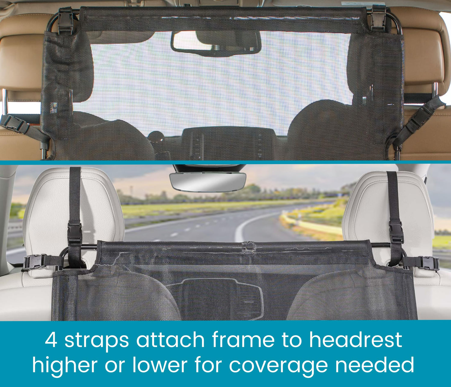 - Dog Back Seat Net Divider That Won't Block the View - designed by High Road in the U.S. in 2014, our sturdy metal and mesh car dog barrier with a chew-resistant coated net separator panel allows 4-pawed road trip companions a full view of the front seat to help reduce ride stress while giving drivers an open view of the road