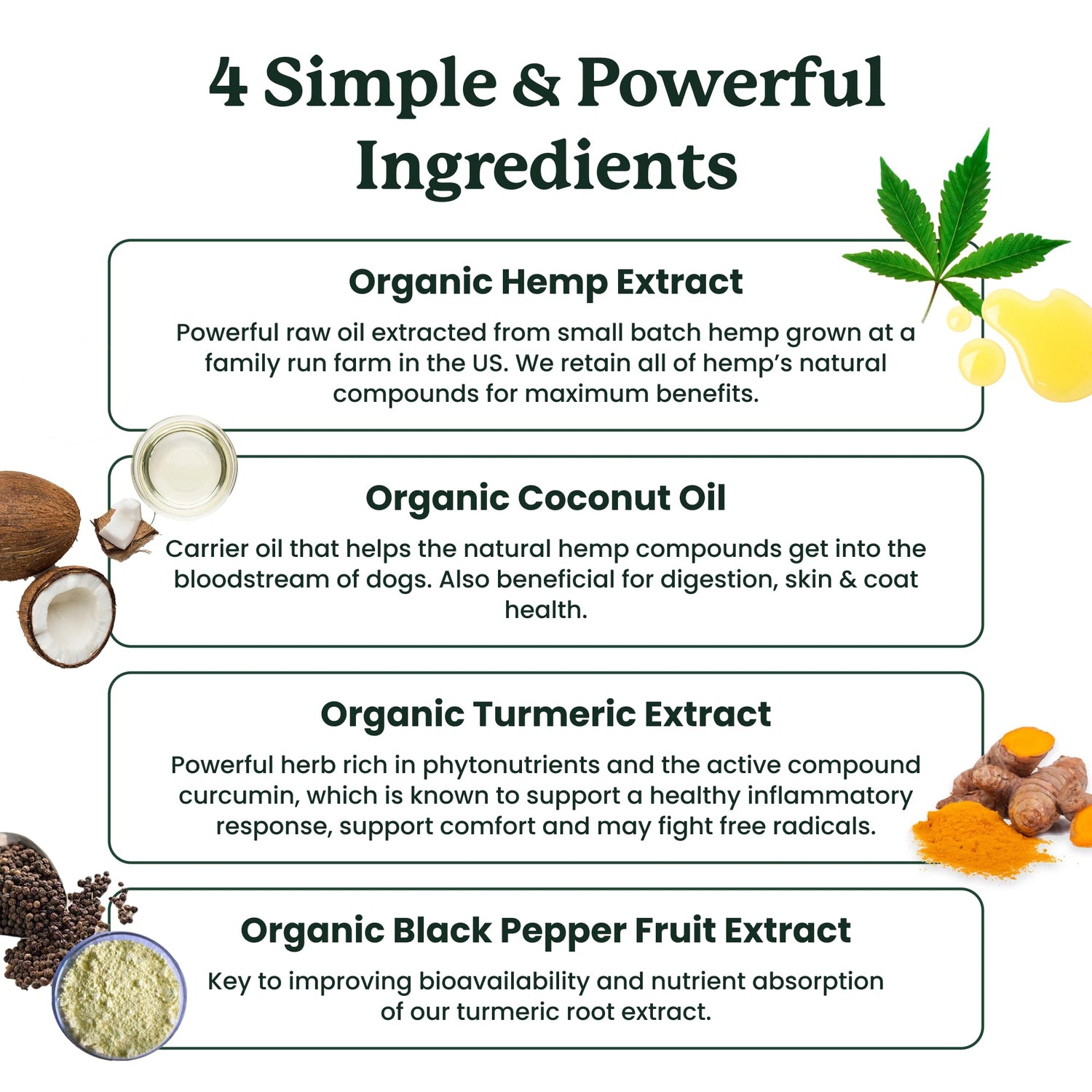 - TURMERIC SUPPORTS A HEALTHY IMMUNE RESPONSE - Lolahemp Hip & Joint Oil is made with all-natural turmeric that has shown to support many aspects of canine health, including a dog’s inflammatory response.