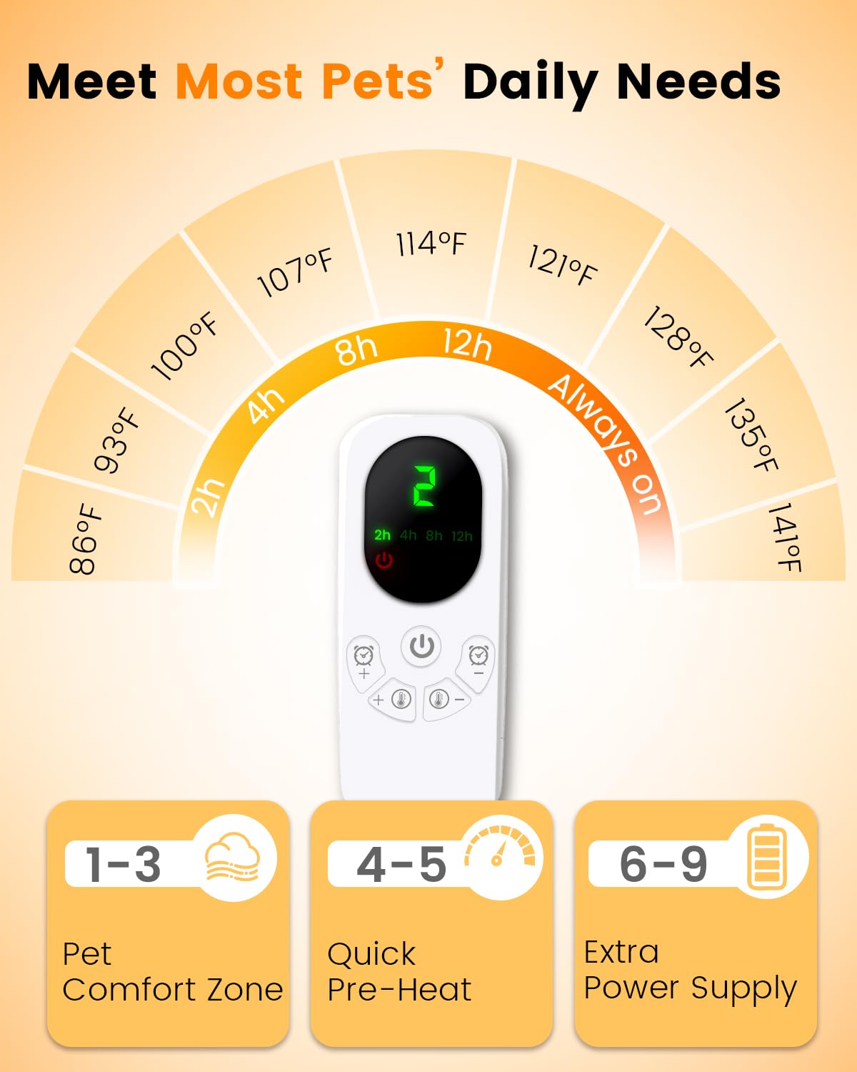 - 9 Heating Levels and 5 Timer Modes - This pet heating pad features most popular temperatures and timer modes to meet most pets' daily needs. With an intuitive interface and clear visual feedback, adjusting settings is effortless