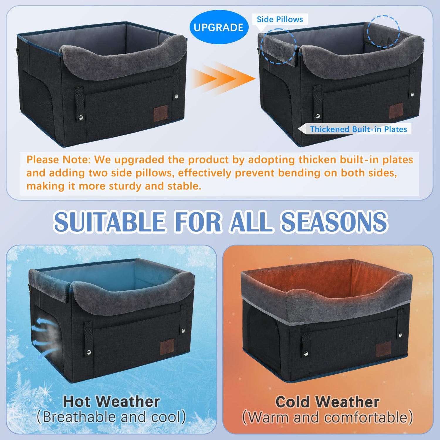 • All Season and Two Heights: Breathable mesh without seat cover is more suitable for hot weather, with plush seat cover is better for cold weather, keeping pets warm in winter and cool in summer. The elevated design can elevate your pet 3.9 inches high above the vehicle seat, allowing pets to sit higher and look out the window to reduce anxiety