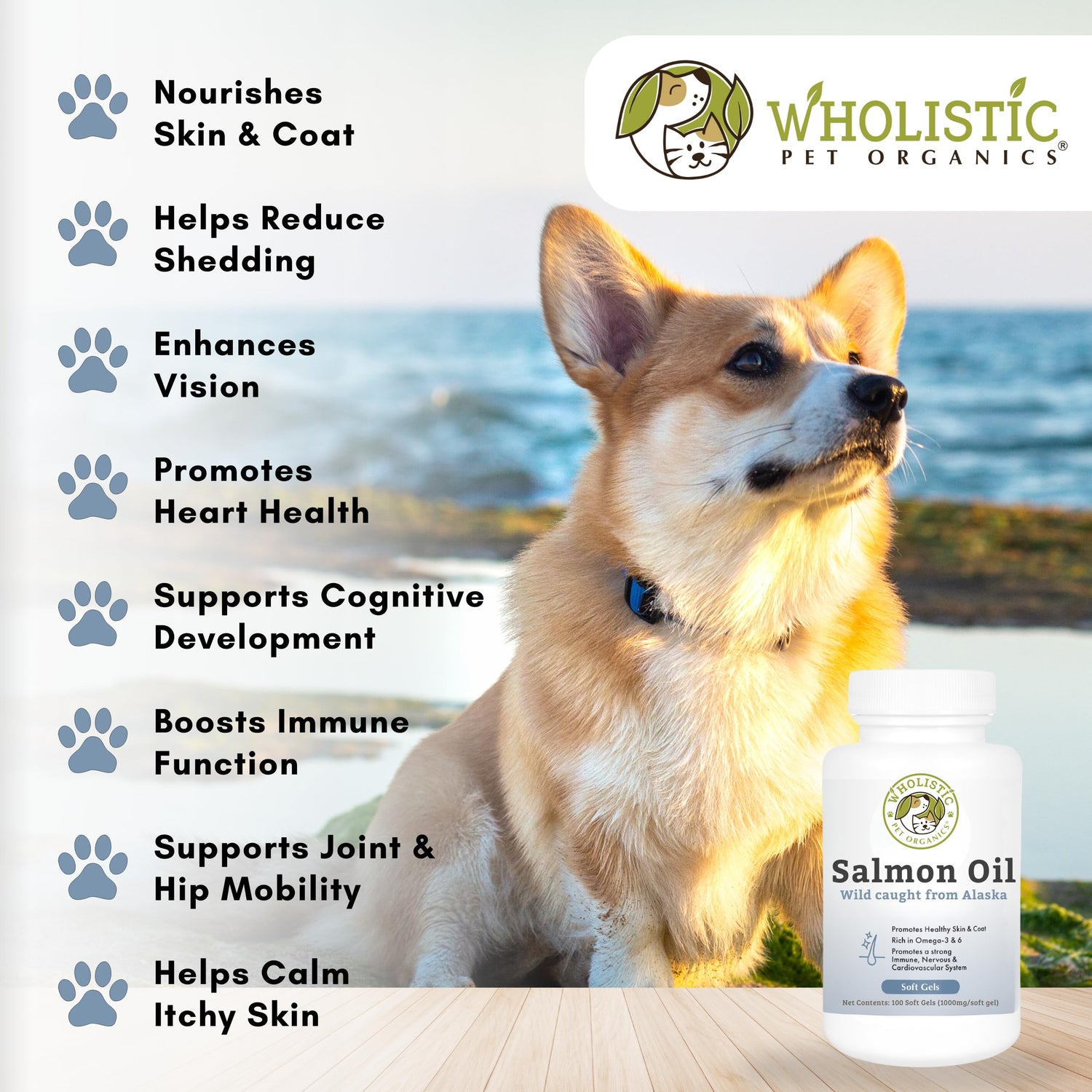 Wholistic Pet Organics Wild Alaskan Salmon Oil for Dogs - 100 Soft Gels - Rich Omega 3 Fish Oil with EPA & DHA for Skin, Coat, Joint, and Heart Health - Natural Dog Skin & Coat Care