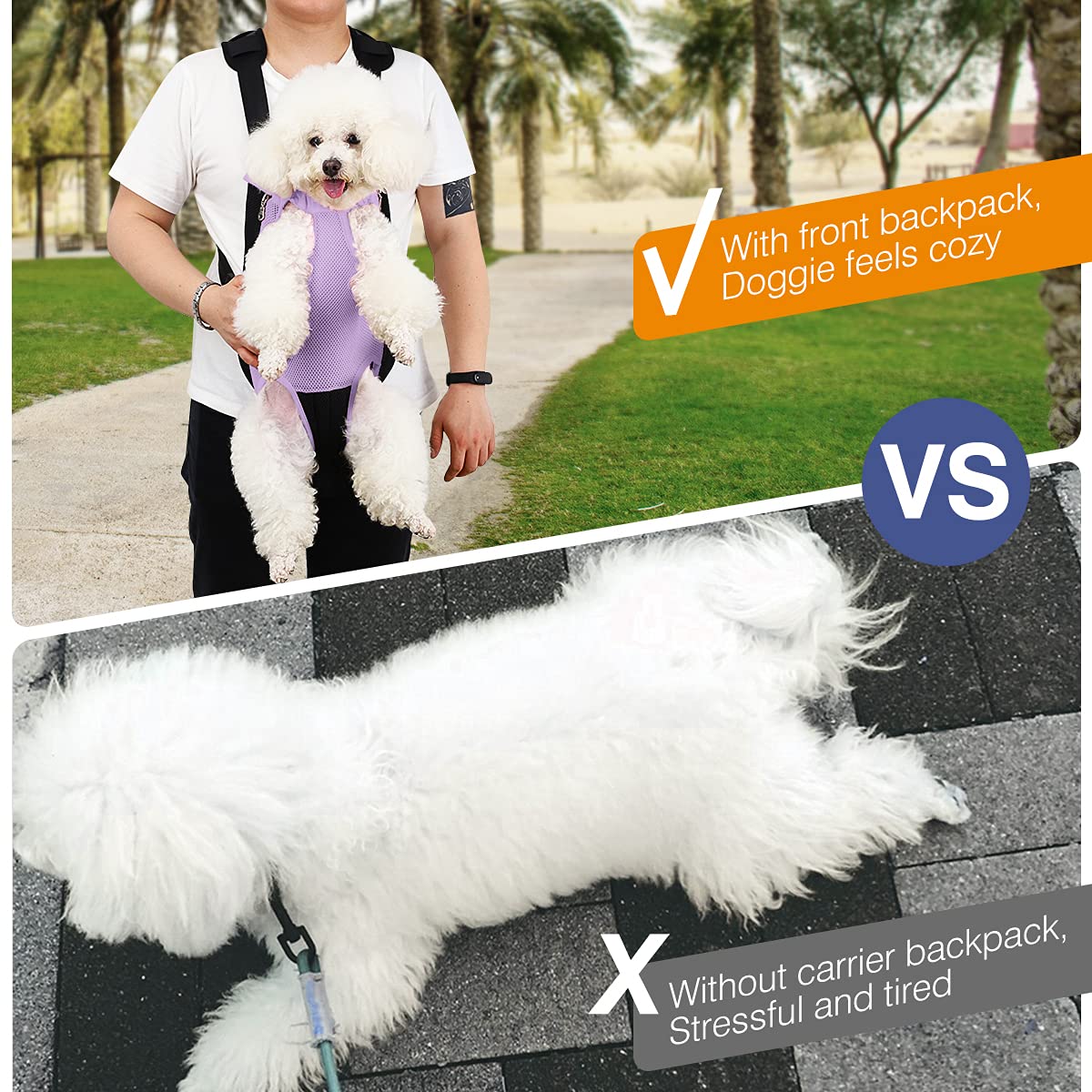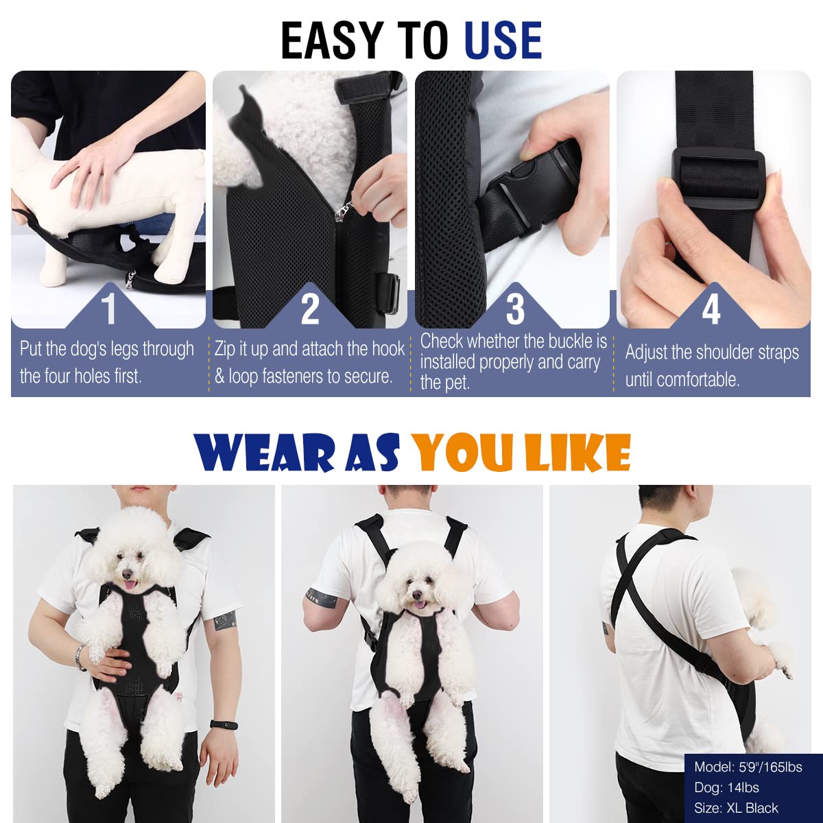 - Two Ways of Wearing: A hands-free pet carrier can be worn on your front side or your backside if you like, it keeps you closer and increases pet's sense of security when you carry your cat or dog around. Meanwhile, the thickened sponge pad helps to relieve the burden of your shoulder.