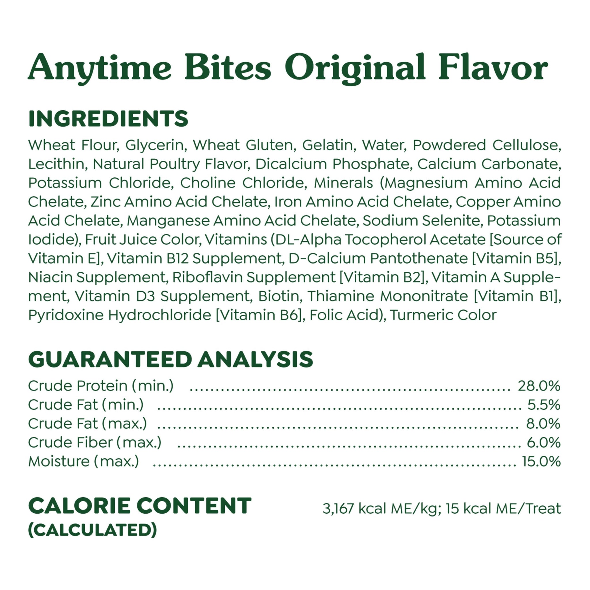 Details: Greenies understands the joy of rewarding your furry friend with delightful dog snacks that are both tasty and thoughtful. Greenies Anytime Bites Original Flavor Dog Treats are the perfect dog treat for those moments when you want to give your dog a little something extra. Bite-sized for frequent treating, these dog treats are ideal for training sessions or simply showing your furry friend some love throughout the day. Made with natural ingredients plus vitamins, minerals, and nutrients, and only 13 calories per treat, Greenies Anytime Bites Original Flavor Dog Treats offer a wholesome option that you can feel good about with plenty of mouth-wowing flavor. These easy-to-digest, chewy dog treats have a texture that dogs can’t wait to sink their teeth into. These dog snacks are sure to become a favorite in your household. Whether you're looking for a quick reward or need a treat for training time, Greenies Anytime Bites Dog Treats Original Flavor are the tail-wagging choice. Make Health A Treat!