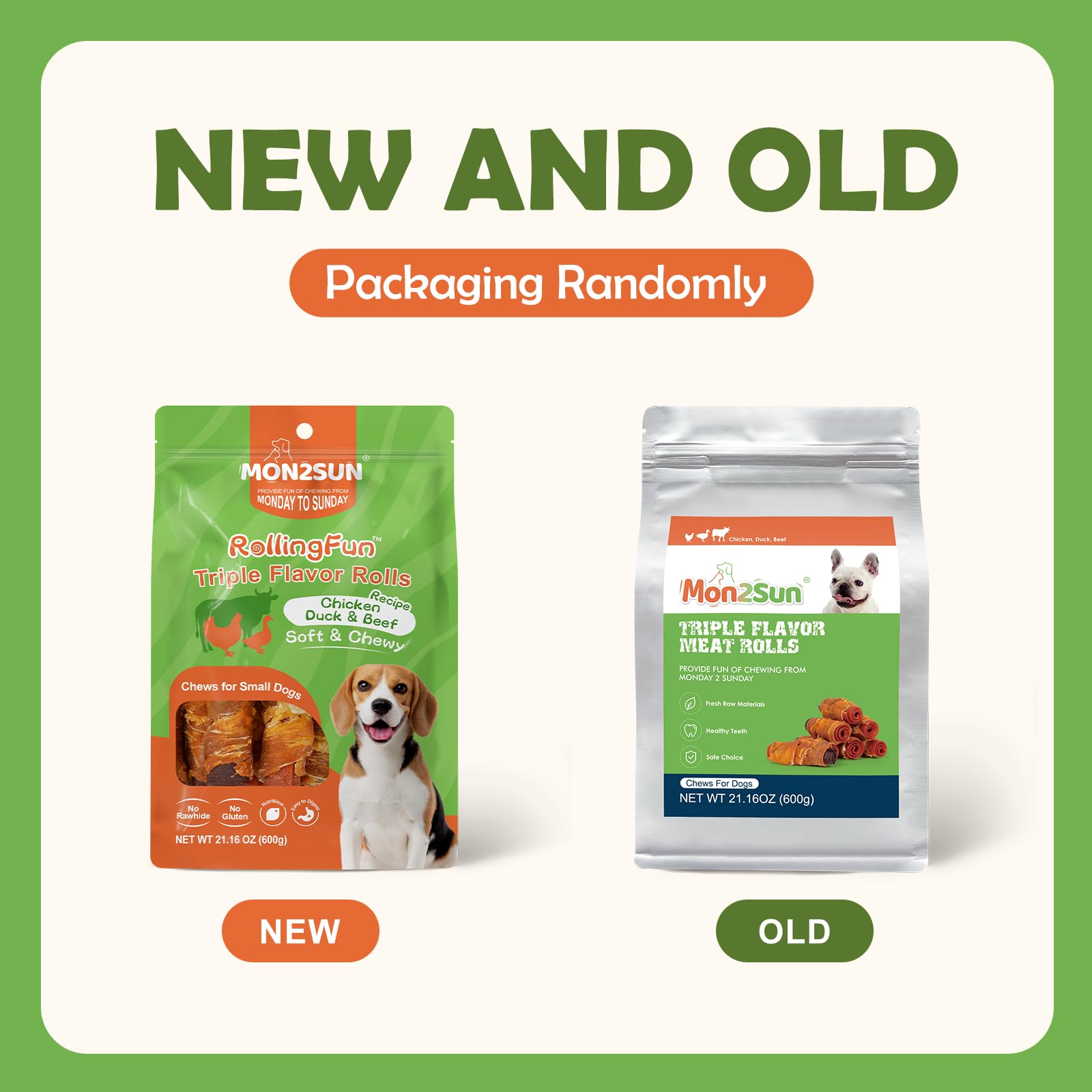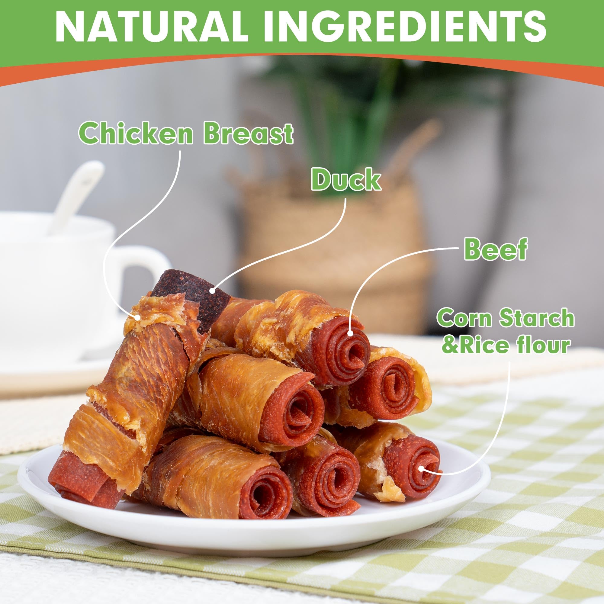 - [Natural Ingredients] Made with real chicken, duck, beef, corn starch and rice flour. Triple flavored rolls are healthy and nutritious.
