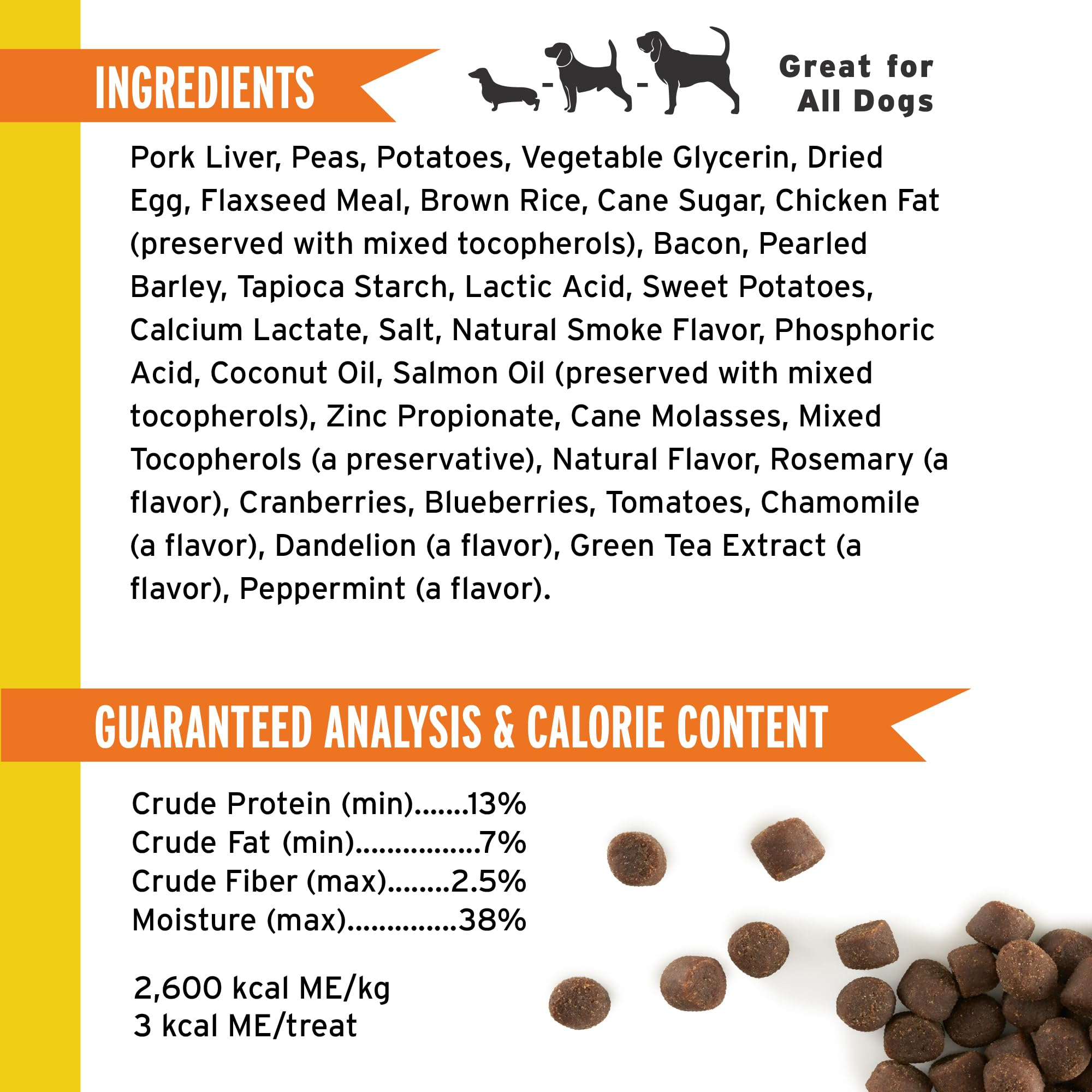 - BIG MOTIVATION IN EACH MINI BITE. Each of these 3 calorie treats are packed with flavor from pork liver, real bacon, and added botanicals that will keep dogs focused and eager to learn!