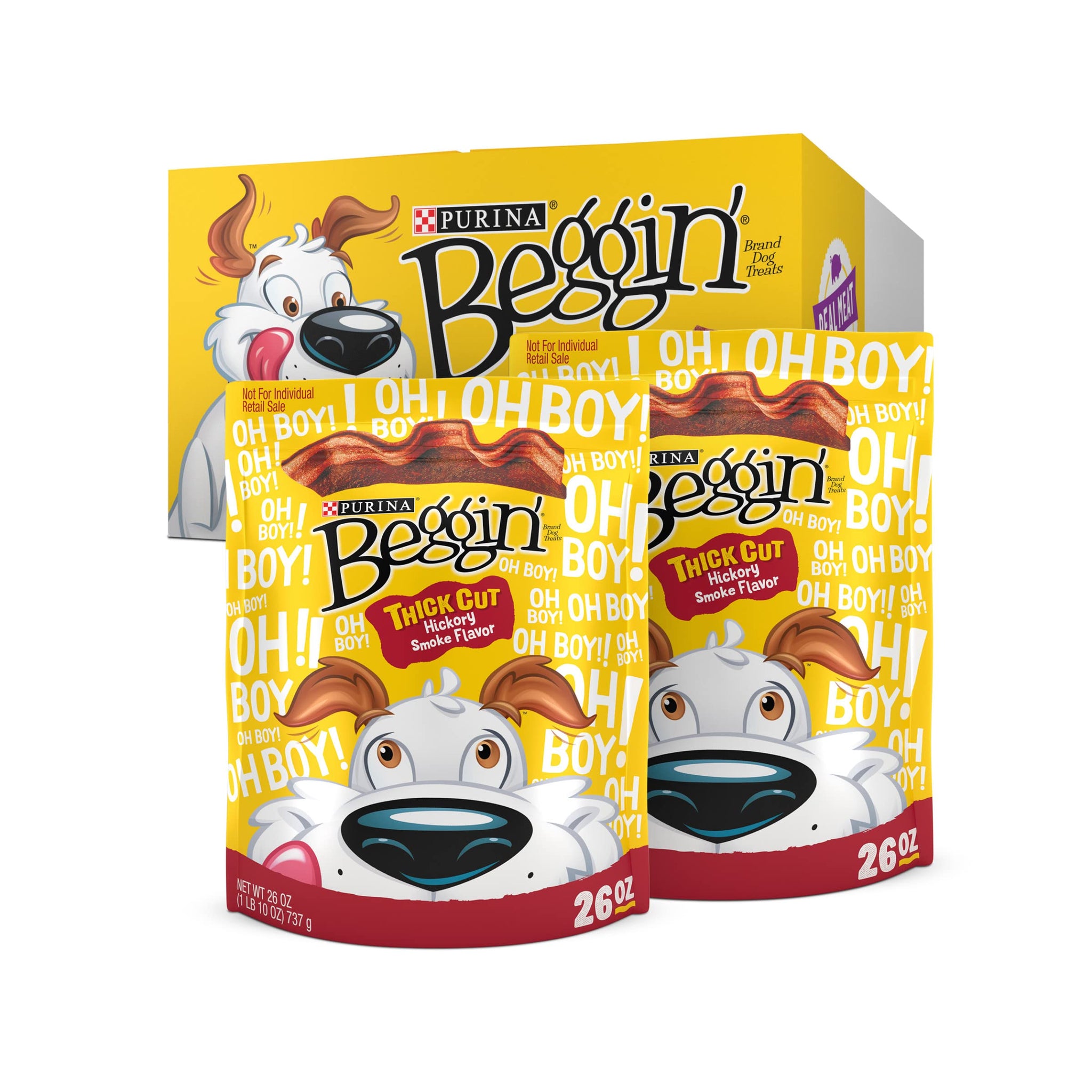 Details: Watch your good boy go bonkers at the slow-cooked taste of Purina Beggin' Strips Thick Cut Hickory Smoke Flavor adult dog treats. Each of these chewy snacks for dogs is made with real bacon to drive your dog wild. Real meat is the first ingredient in these bacon-flavored, soft dog treats, and best of all, every one is shaped just like a strip of thick-cut bacon. That gives you Purina dog snacks that look as tempting as they taste. These soft chews for dogs are sure to get your pal's tail wagging with their satisfying texture. Plus, the jerky dog treats are easy to tear into smaller pieces for bite-sized bits of yum. With the look and smell of real bacon, these Beggin' Strips soft treats for dogs are so good, he's sure to think they're people food. Watch as he goes berserk for the hickory smoke flavor that awaits him. These Purina Beggin' strips bacon flavor treats contain no artificial flavors or FD and C colors, so you can feel good about tossing your eager dog a strip.
