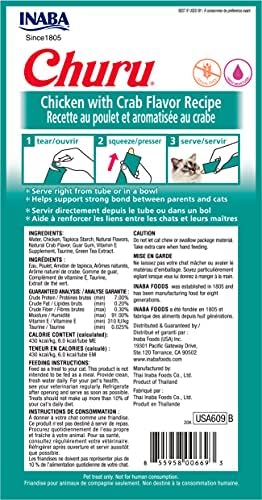 INABA Churu Cat Treats, Grain-Free, Lickable, Squeezable Creamy Purée Cat Treat/Topper with Vitamin E & Taurine, 0.5 Ounces Each Tube, 24 Tubes (4 per Pack), Chicken with Crab Recipe