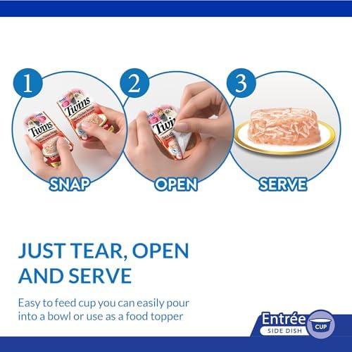 - TWICE THE TOPPERS: Twins are two single serve portions of shredded chicken suspended in a savory chicken broth gelée. Simply break apart, pull back the lid and use as a topper on wet or dry cat food or as a side dish/complement to their meal