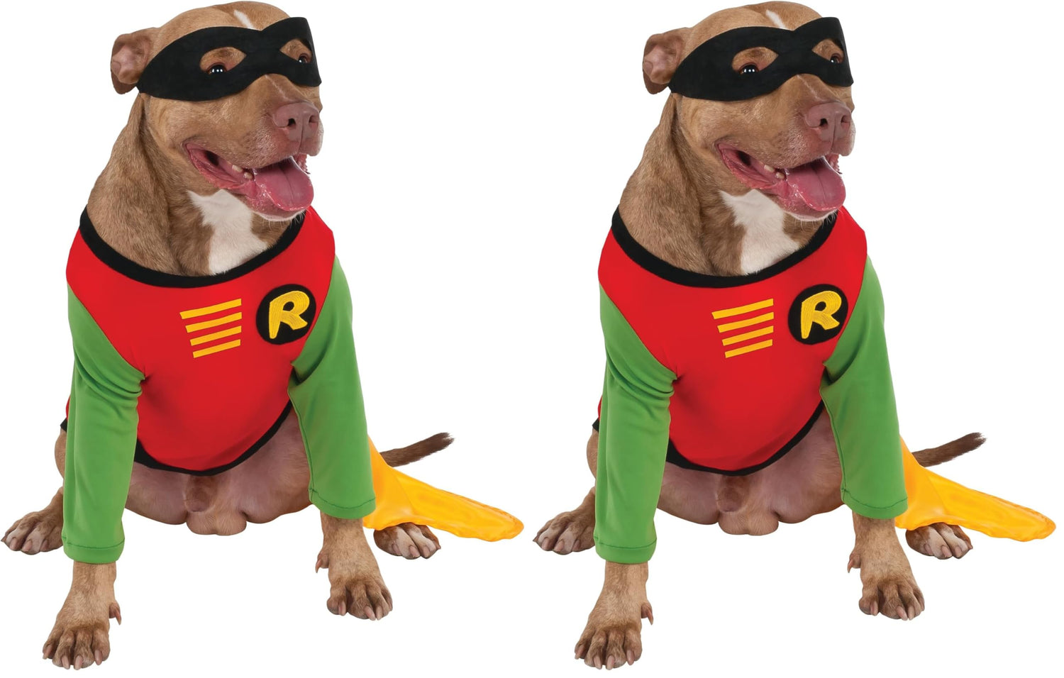 - IMPORTANT DETAILS: DC Comics Teen Titans Robin pet costume comes with a vibrant red shirt featuring green sleeves, a detachable cape, and an eye mask