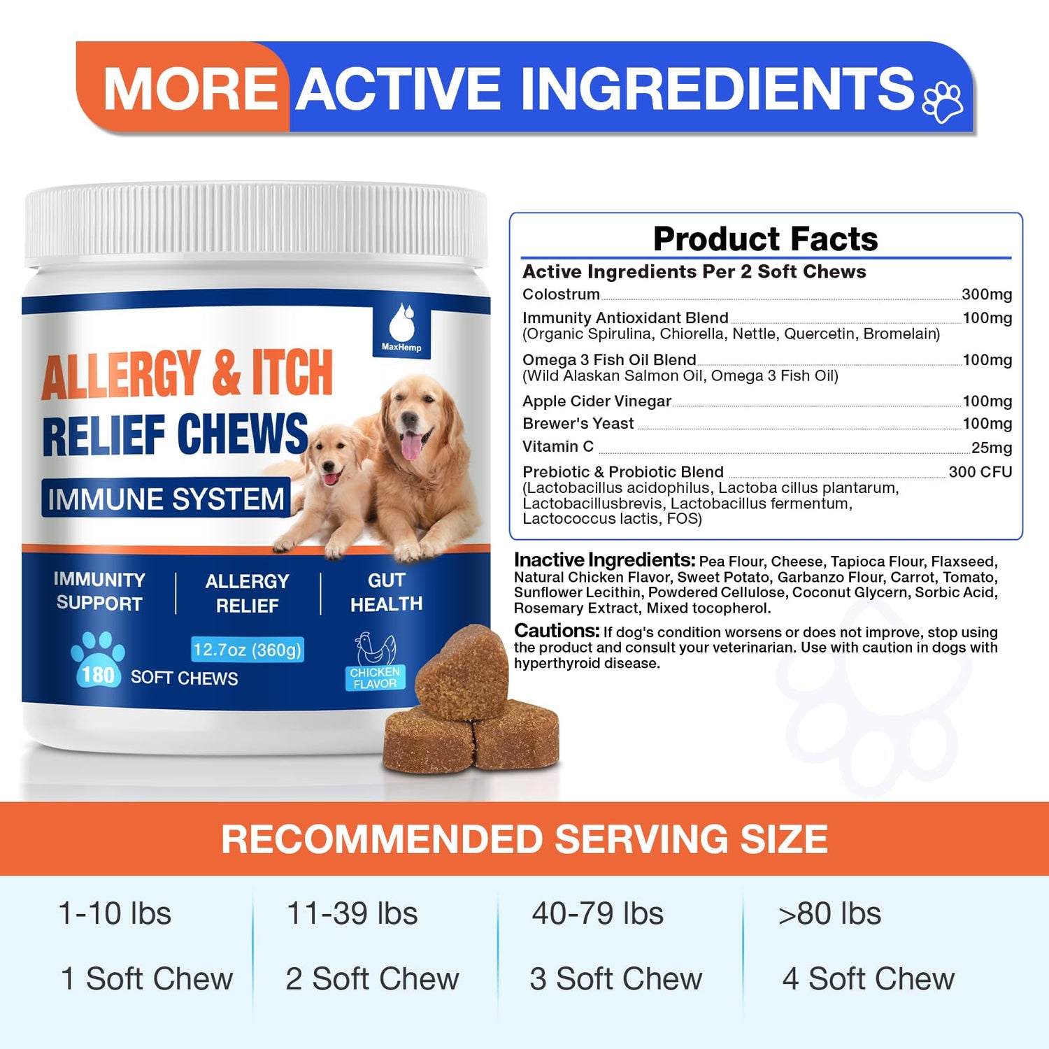 Dog Allergy Chews - Itching Skin Relief - 180 Chews Natural Dog Allergy Relief Treatment for Paw Licking, Anti-Itch, Dry Skin, Hot Spots, Allergies & Immune Support Supplement