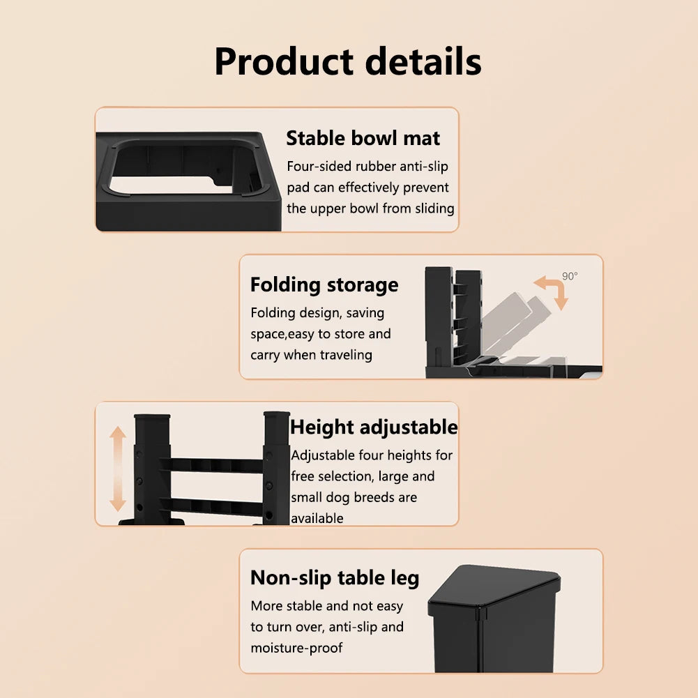 1.【Protect the pet's cervical spine】: The pet folding table has four sizes for you to adjust. You can adjust it according to the height of the pet. It can effectively protect the pet's cervical spine and avoid damage to the pet's cervical spine caused by the pet's long-term eating. The pressure on the cervical spine is relieved, and the height of the base improves the eating posture, making it easy and effortless to eat every meal.