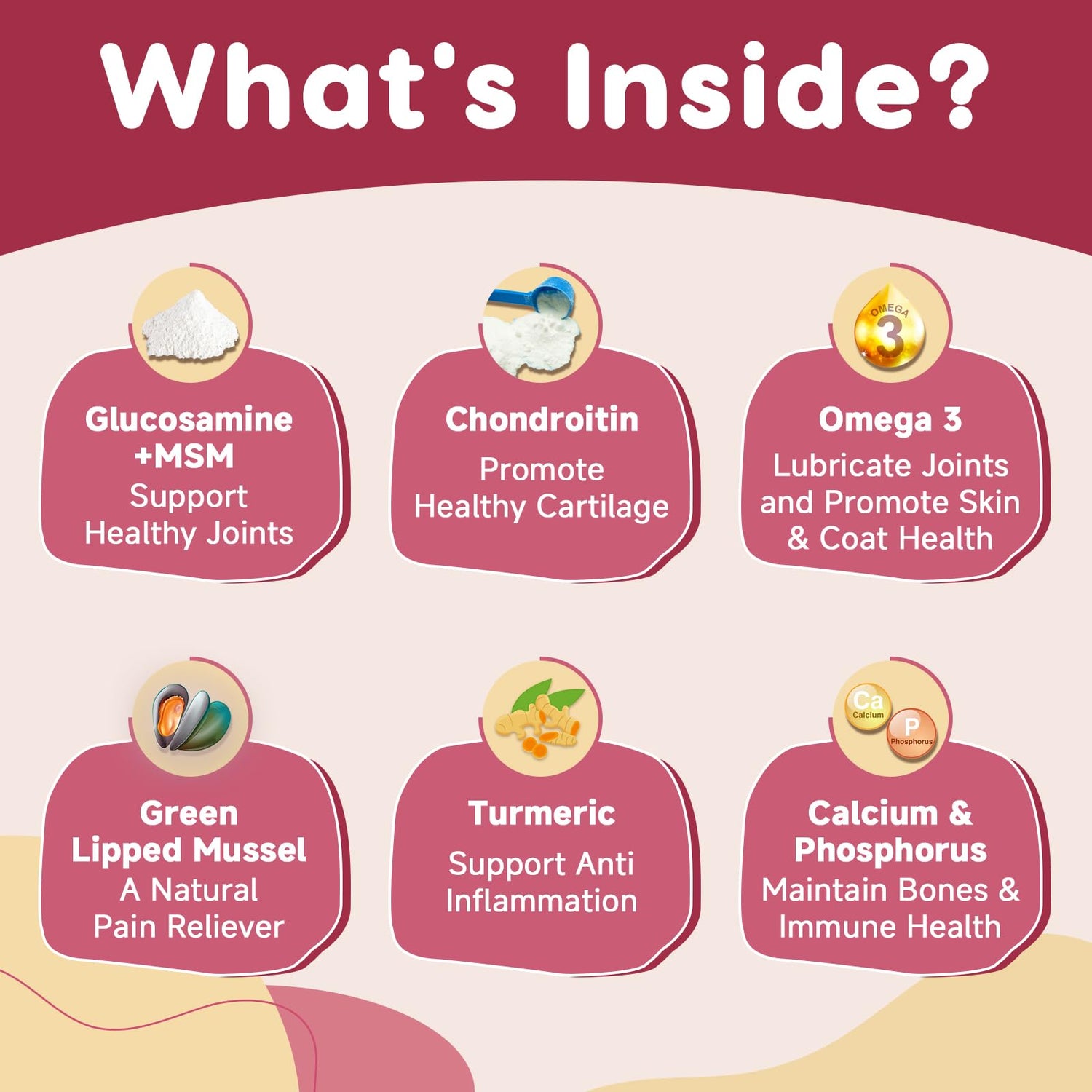- Focus on Anti-inflammation & Pain Relief: Our dog joint supplement large breed adds Omega 3 for joint lubrication. Turmeric may help reduce inflammation, ease symptoms like stiffness, swelling & pain caused by arthritis and imrove mobility function