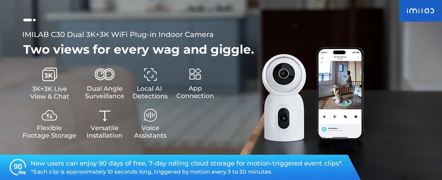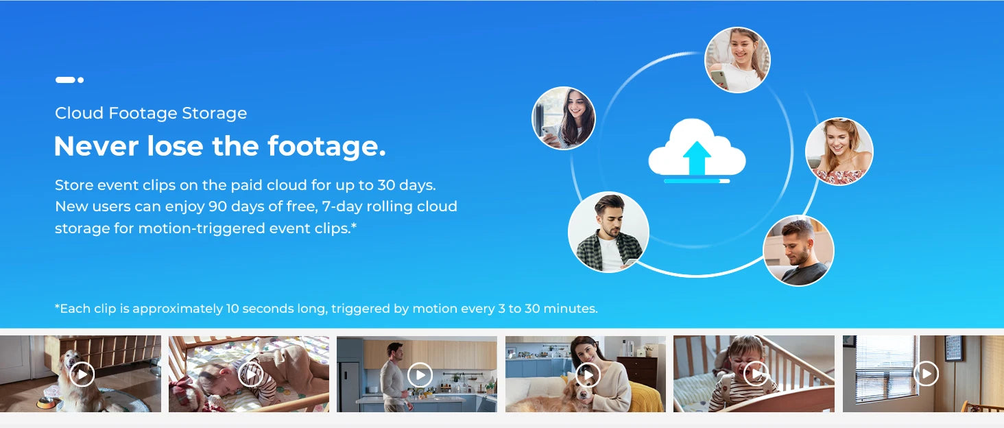 【Free Event Clip】New users get 90 days of free, 7-day rolling event clips. Each clip is about 10s long, triggered by motion every 3 to 30 minutes.