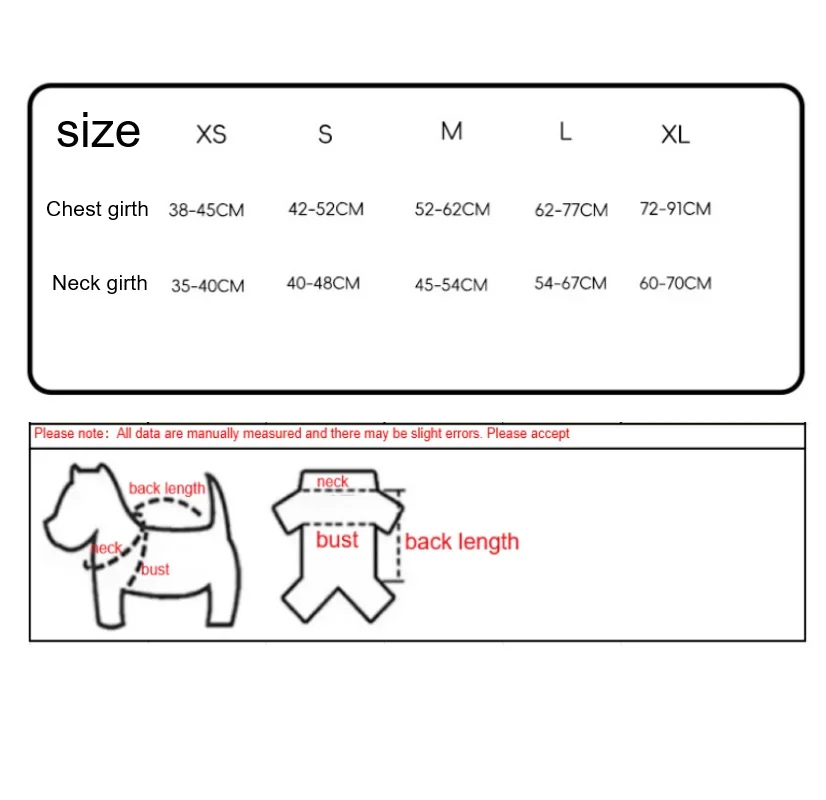 XS, Suitable chest circumference: 38-45cm; suitable neck circumference: 35-40cm;