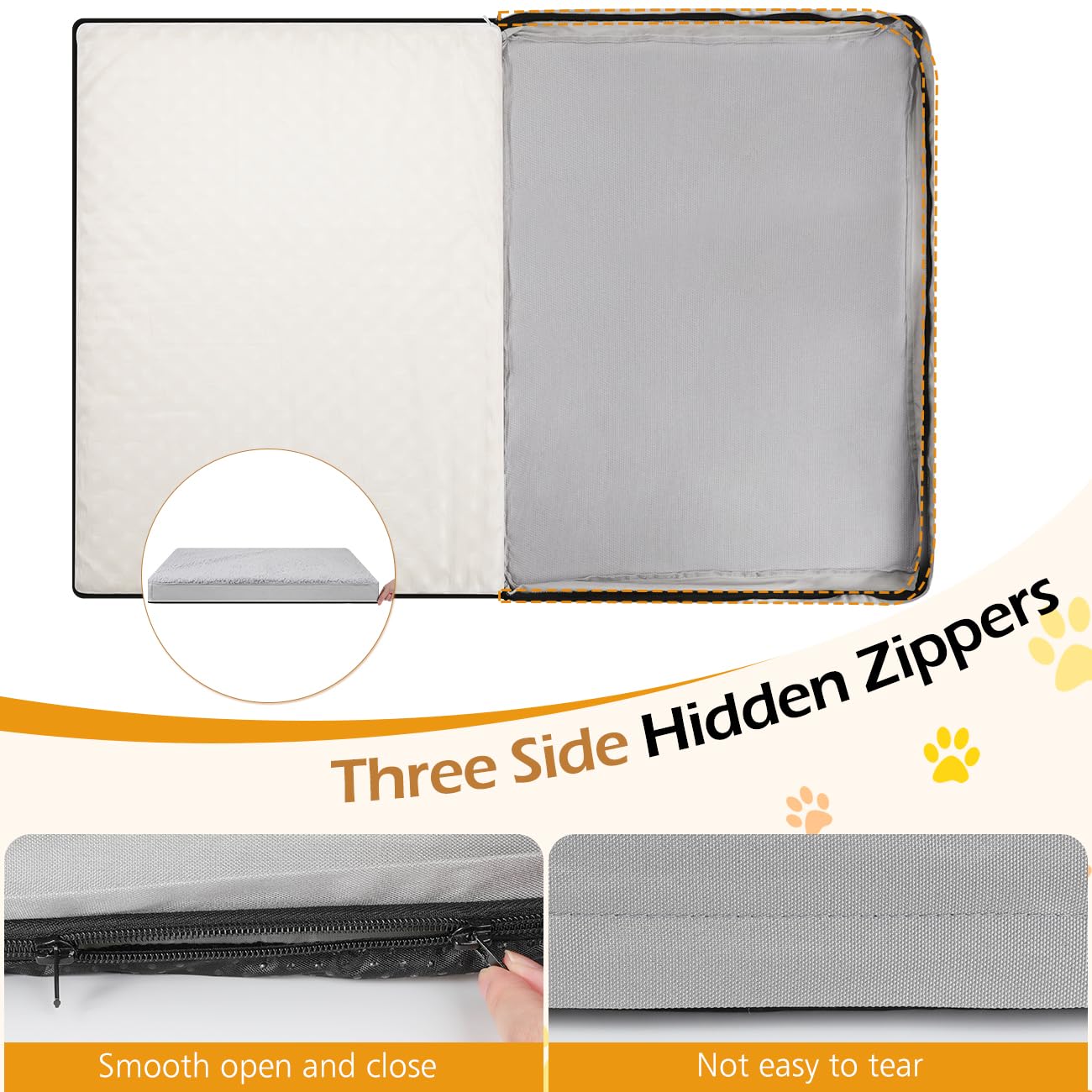 - 3-Sided Zipper: With wrap-around hidden zipper design, this washable dog bed cover can prevent liquid from penetrating through the zipper and avoid pets accidentally tearing the zipper. In addition, in order to make the installation more convenient for customers, we adopt a smooth 3-sided continuous zipper, which is super convenient for changing and removing the bed core.