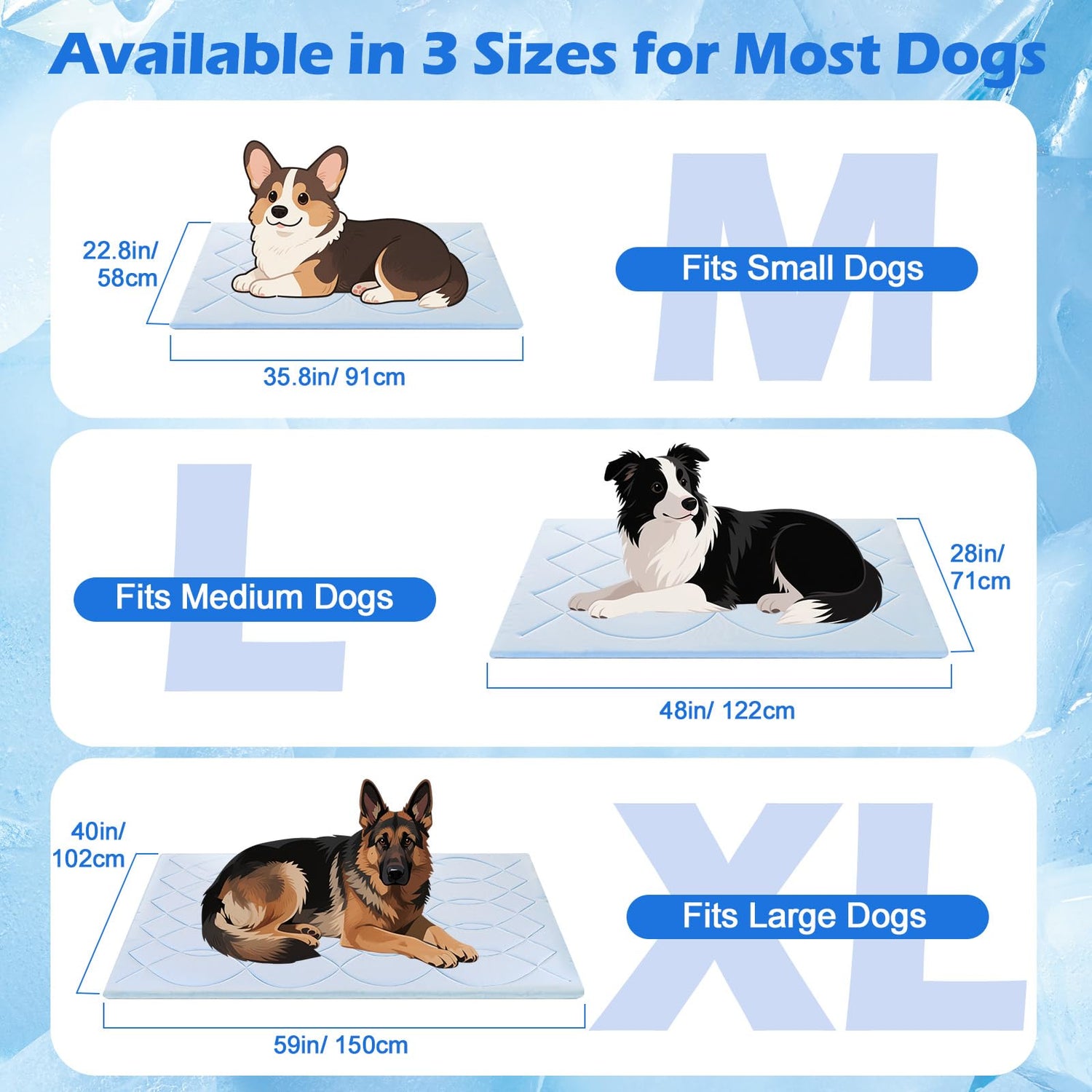 - Multiple Sizes Available: Our dog cooling pads offer multiple sizes for you to choose from: M-35.8"×22.8"×0.8" (91×58×2cm), L-48"×28"×0.8" (122×71×2cm), XL-59"×40"×0.8"(150×102×2cm). Multiple sizes are available to meet the needs of different size pets and are perfect for small, medium and large dogs. You can make a proper choice according to your dog's size.