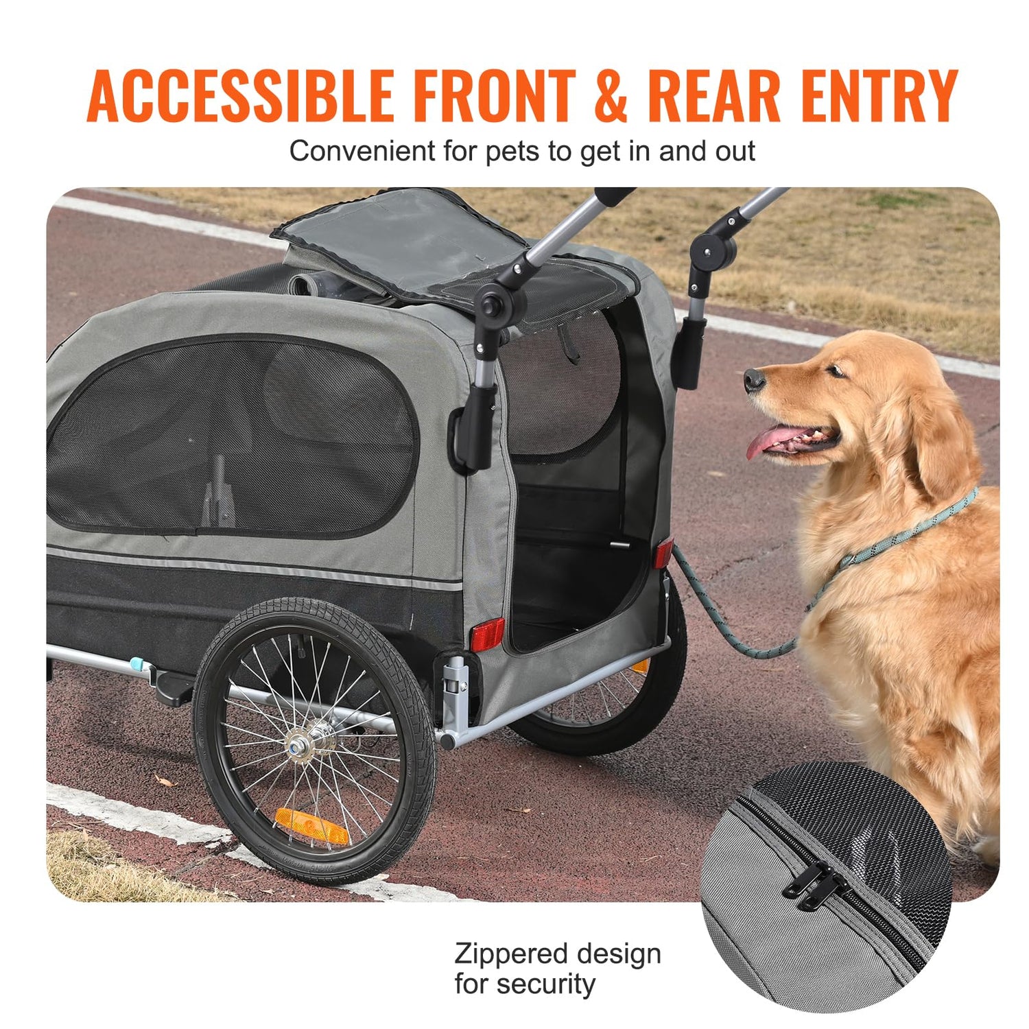 - Easy In, Easy Out: Getting your pet in and out is a breeze with this pet bike trailer. The transparent front door provides protection from wind and rain while ensuring excellent ventilation. Your pet can hop in through the zippered front and rear doors and even stick their head out, all with ease.