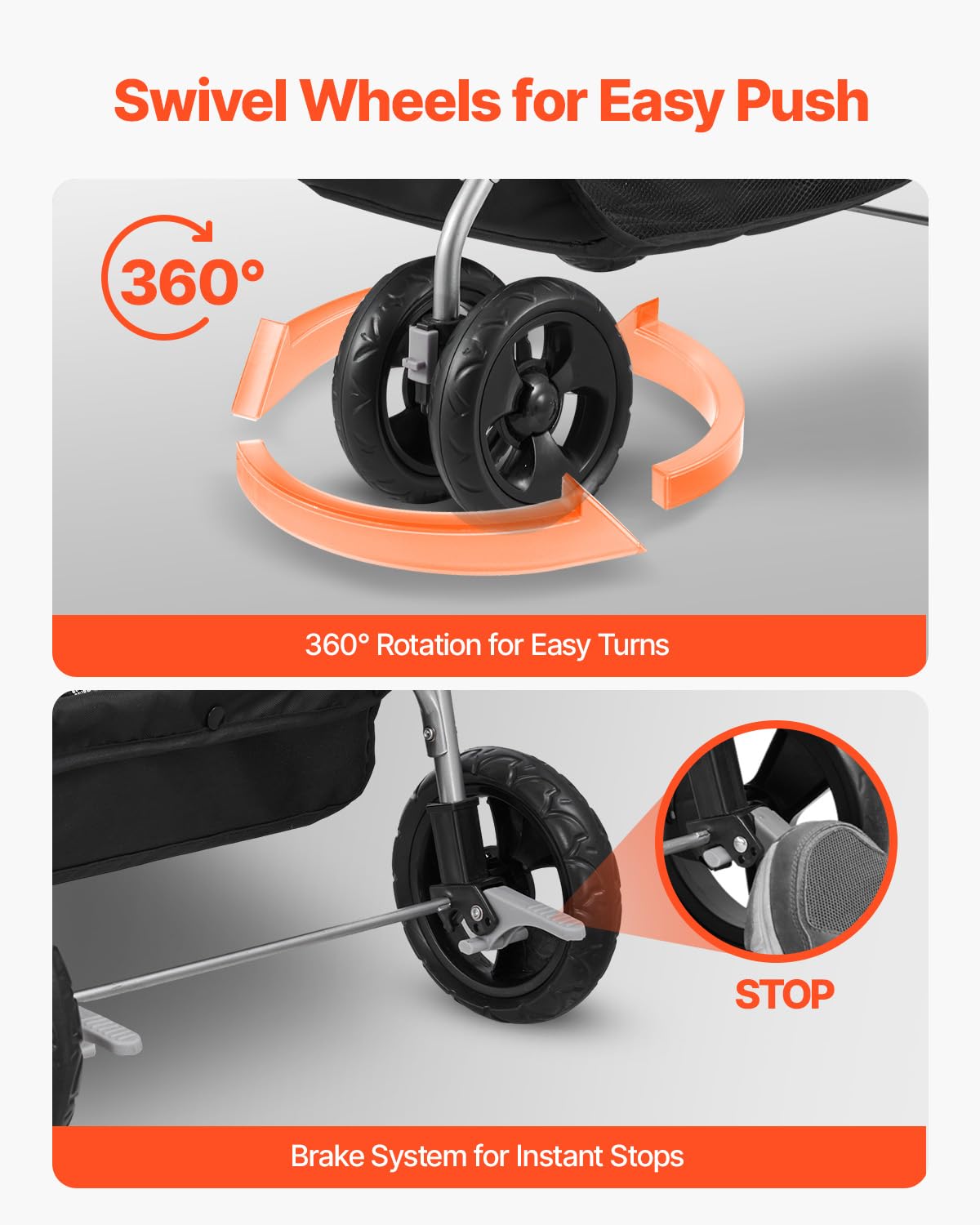 - Smooth and Stable Mobility: Featuring 6-inch EVA foam wheels for shock absorption, this foldable pet stroller offers versatility across grass, sidewalks, and sand. A 360Β° rotating front wheel ensures easy navigation, while rear brakes provide security during stops.