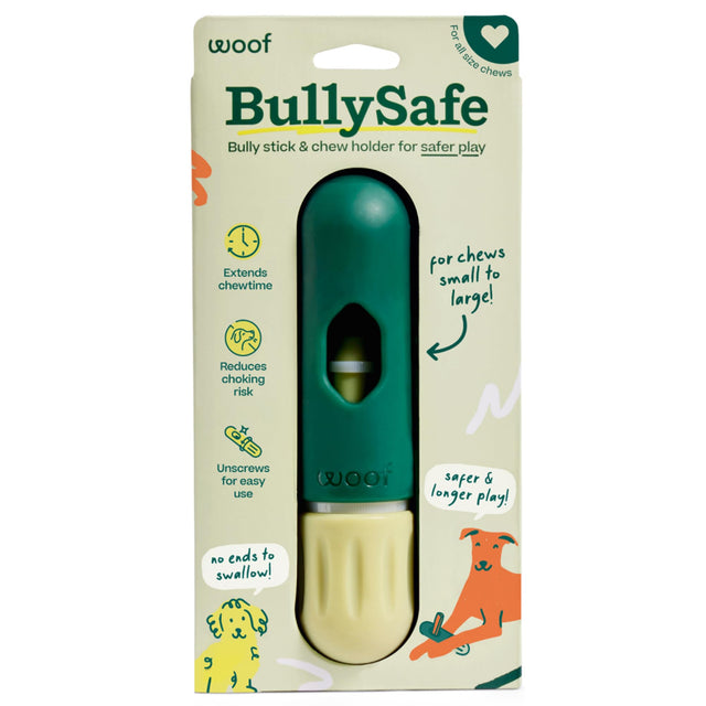 - More Chew Time, Less Worry: Enjoy safer playtime with BullySafe – the ultimate bully sticks holder! Designed to offer pups healthy play and owners peace of mind, it ensures your pup can chew safely without accidentally swallowing bully stick ends. Say hello to safer fun for your furry friend with our innovative dog treat holder! For best results, use the BullySafe with Woof Bully Sticks for dogs 10 lbs and up.