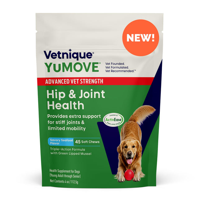 - EXTRA-STRENGTH FORMULA β Advanced Vet Strength Chews contain 47% more ActivEase GLM, 150x more Omega 3, and 67% more Hyaluronic Acid than original YuMOVE Joint Care for a higher level of support.